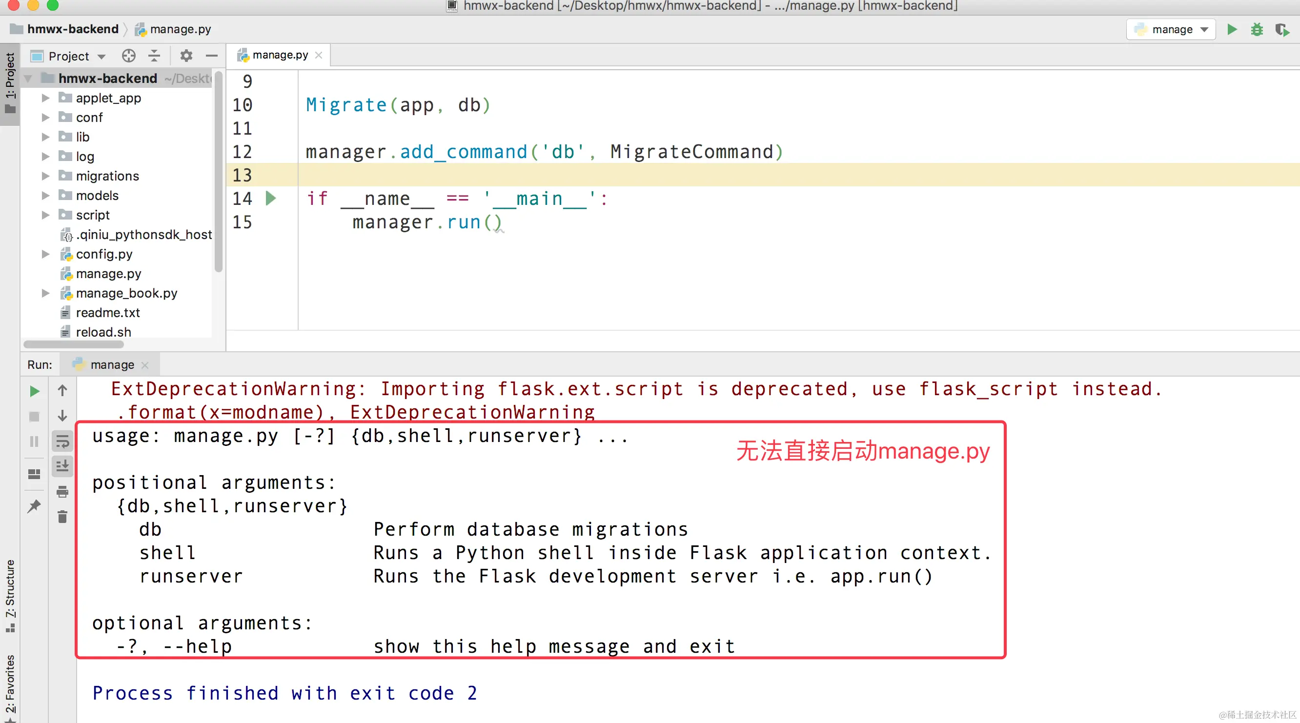 - 项目启动文件manage.py,如果直接运行,会有如下提示信息。