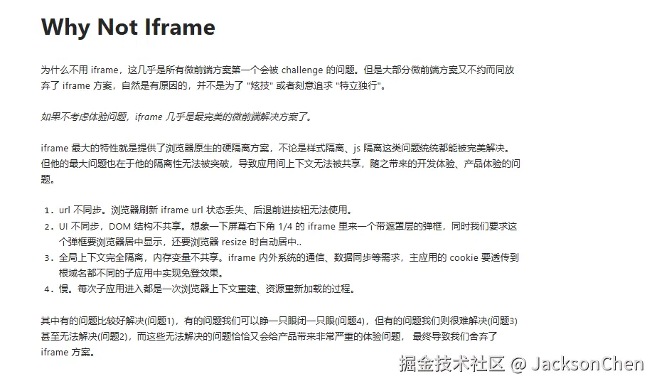 iframe 是浏览器提供的“物理”硬隔离方案,简单粗暴且隔离性最强,但牺牲了用户体验、通信效率和资源复用。它解决了“安全地嵌入”的问题,但难以解决“无缝地集成”的问题。