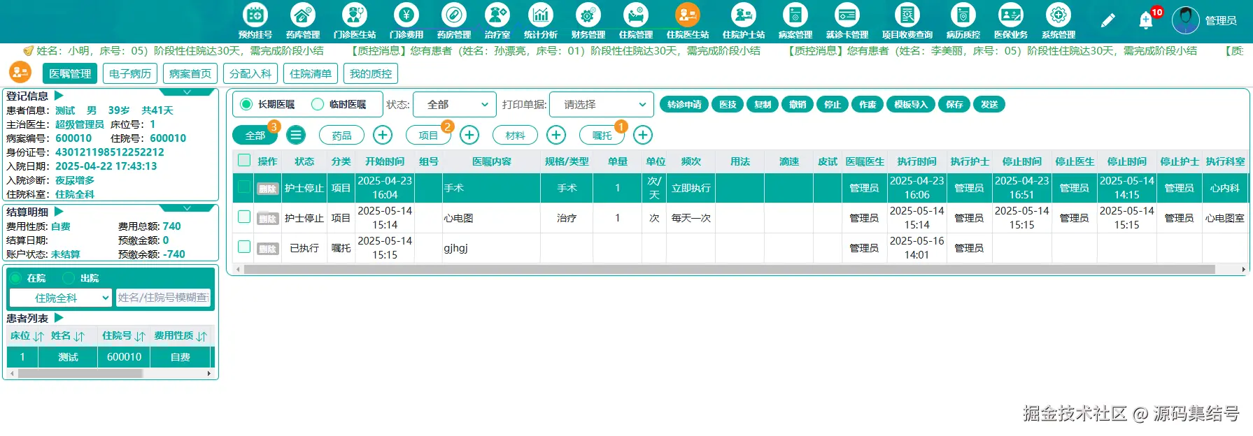 住院医生站是提供给住院部医生使用的界面,只有分配了医生或相关角色的员工才显示该界面,住院医生站包括六个子模块,分别为:医嘱管理、电子病历、分配入科、住院清单、病案首页、我的质控。