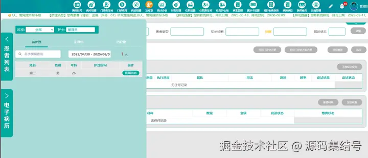 只有分配了护士或相关角色的员工才显示该模块,按照治疗流程,门诊患者处方中的药品、项目中有注射药品或其他需要治疗项目,如吸氧、针灸等在缴费后,患者会自动流转到治疗室模块中来进行治疗。