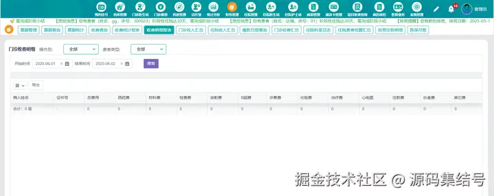 票据管理、票据查询、票据统计、收费查询、收费统计报表、收费明细报表、门诊收入汇总、住院收入汇总、缴款日报查询、门诊收费汇总、住院科室日志、住院患者结算汇总、收预交款明细、医保月报等。