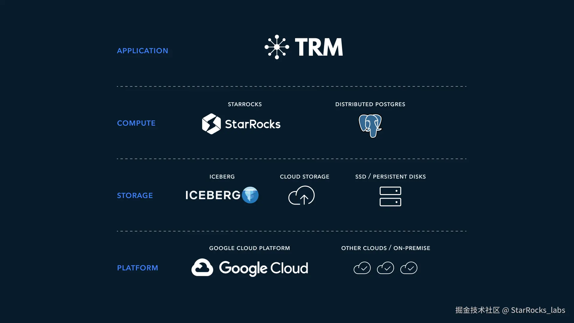 为此,TRM 转向开源生态,基于 Apache Iceberg 与 StarRocks 构建新一代数据湖仓架构,用于支撑面向用户的分析业务。