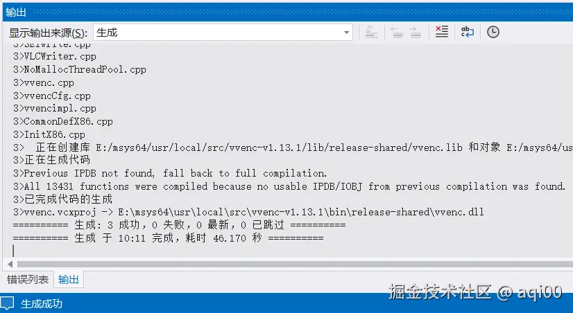 依次选择顶部菜单:生成→生成→生成vvenc,Visual Studio就开始编译vvenc模块。编译过程可在Visual Studio界面下方观察,直到编译完成如下图所示。
