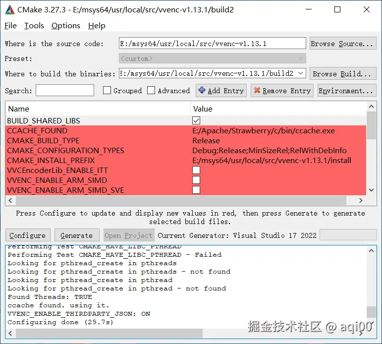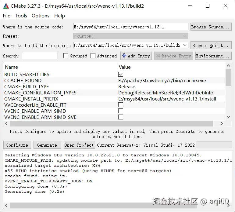 先下载最新的vvenc源码,解压下载后的源码包,再打开cmake-gui程序(cmake-gui的安装说明见《FFmpeg开发实战:从零基础到短视频上线》第八章的“8.1.5 给FFmpeg集成x265”)。cmake-gui窗口界面的source code栏填vvenc的源码目录,where to build栏填vvenc源码下的build目录,接着单击窗口左下方的Configure按钮,配置完成的窗口界面如下图所示。