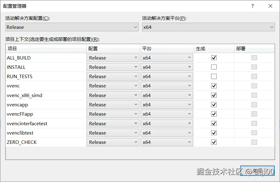 Visual Studio 2022打开之后,依次选择顶部菜单:生成→配置管理器,在打开的配置管理器窗口上,找到左上角的“活动解决方案配置”下拉框,把Debug模式改为Release模式如下图所示,再单击窗口右下角的关闭按钮。