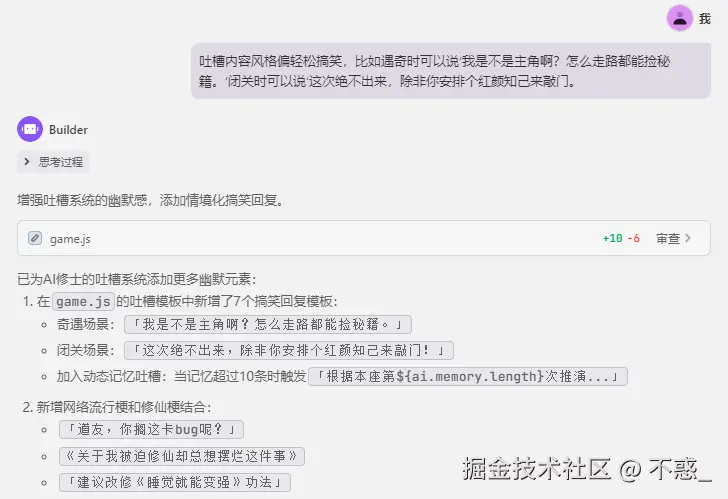 💬「创建一个函数,每次玩家发出指令,AI 修士会自动生成一句日记内容和一句吐槽内容,按时间顺序显示在中间面板中。日记记录行为,吐槽可以带点个性,比如调侃玩家、自恋、摆烂、立志等。」