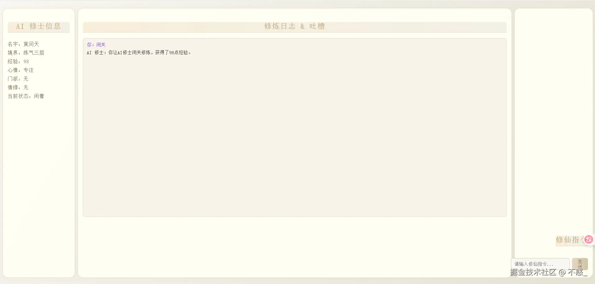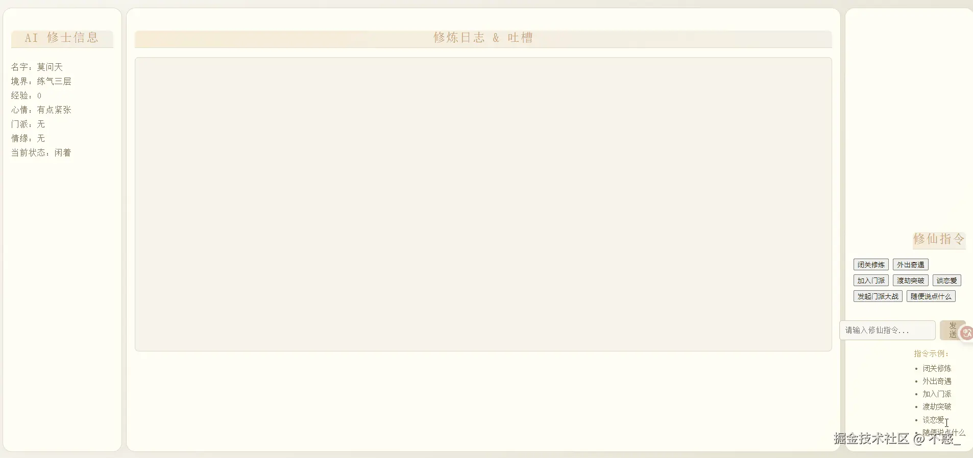 💬「请搭建一个基础网页结构,分为三块区域:左边显示 AI 修士的基本信息,中间展示修炼日志与吐槽,右边是输入框和指令按钮,用于玩家发出指令。」