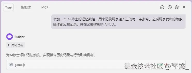 💬「增加一个 AI 修士的记忆数组,用来记录玩家输入过的每一条指令。之后玩家发出的每条操作都应被记录,并在必要时影响 AI 行为。」