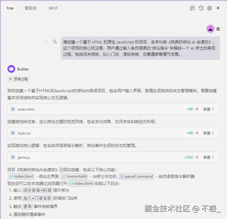 《我养的修仙 AI 会渡劫》可能只是个小型沙雕项目,但它让我第一次感受到:只靠人类语言,也可以“写出”一个完整的产品原型。 Trae AI 的底层机制,结合自然语言解析、MCP 上下文记忆和实时代码生成,正在改变整个创作逻辑。而我这个前端菜鸟,也终于能靠“开口”开发自己的游戏。修仙世界浩瀚如海,下一款作品——说不定是“我被 AI 带飞飞升了”。