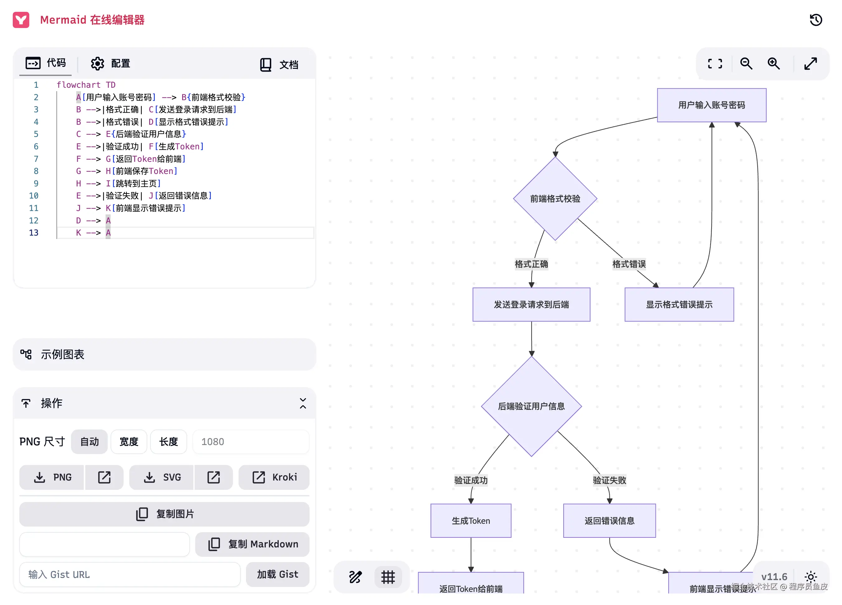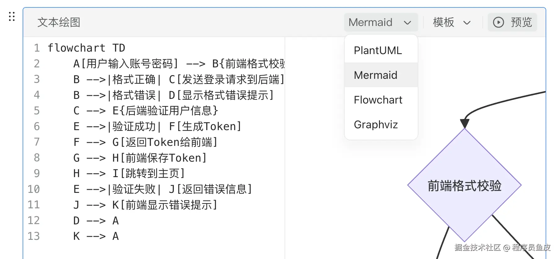 然后你就可以把代码复制到 Mermaid 渲染工具中,比如写作工具语雀支持添加文本绘图组件: