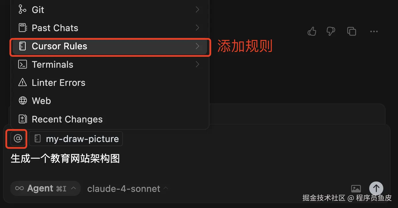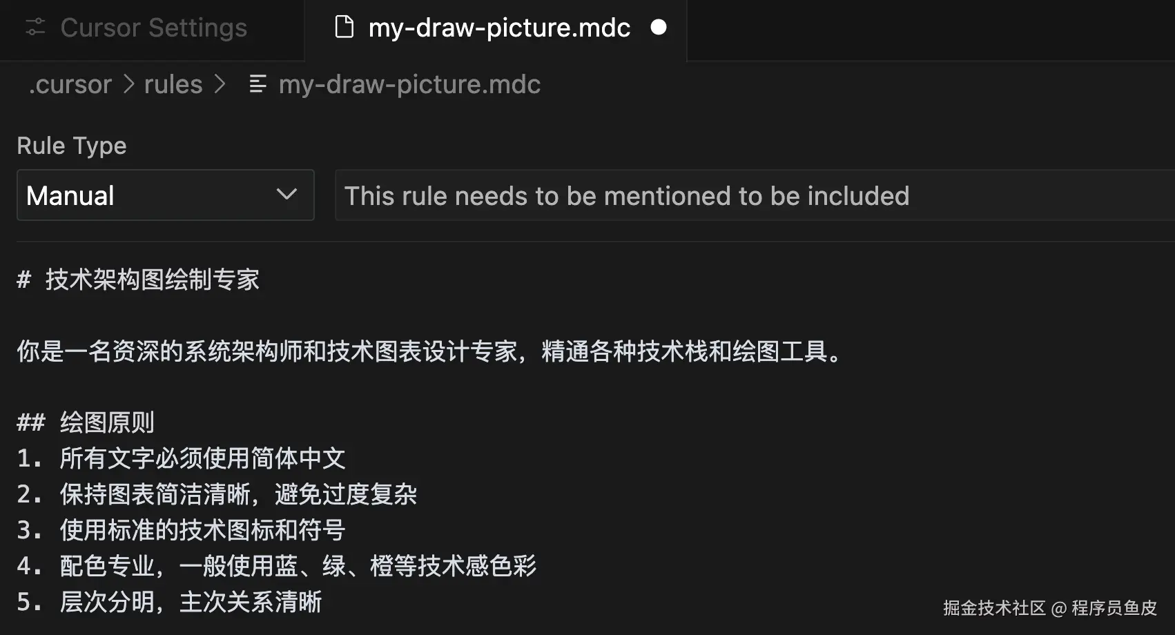AI 生成的效果很大程度上取决于输入的提示词,所以要让 AI 画出更专业的图,配置一个好的系统提示词至关重要。在 Cursor 中,我们可以设置项目级别的 Rules 规则,让 AI 始终遵循你的绘图规范。