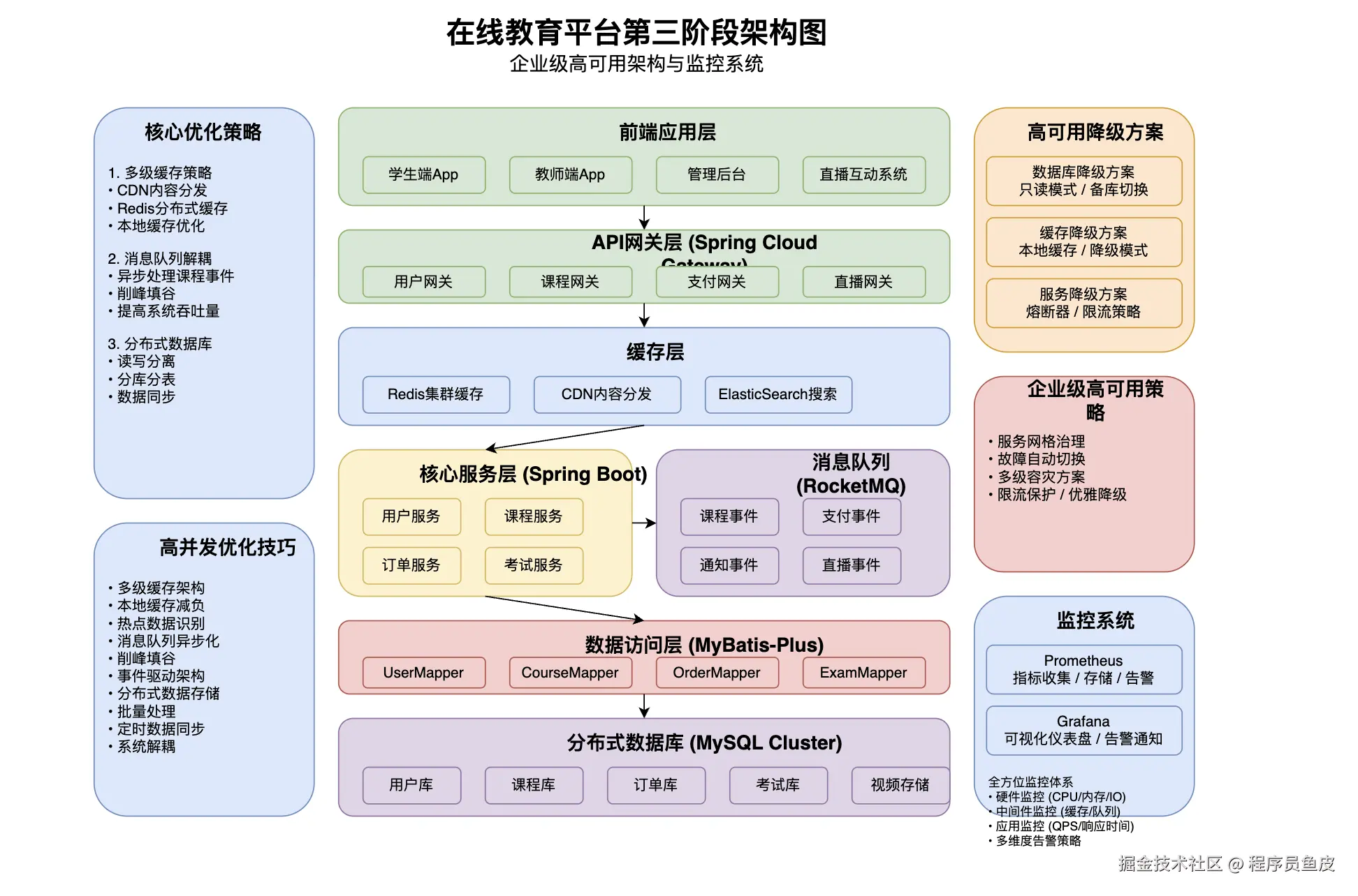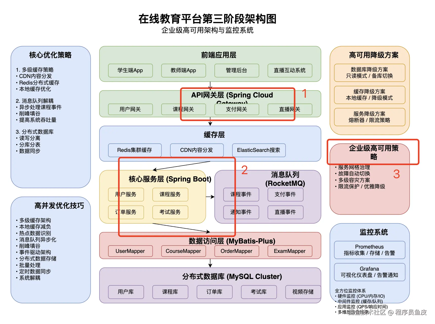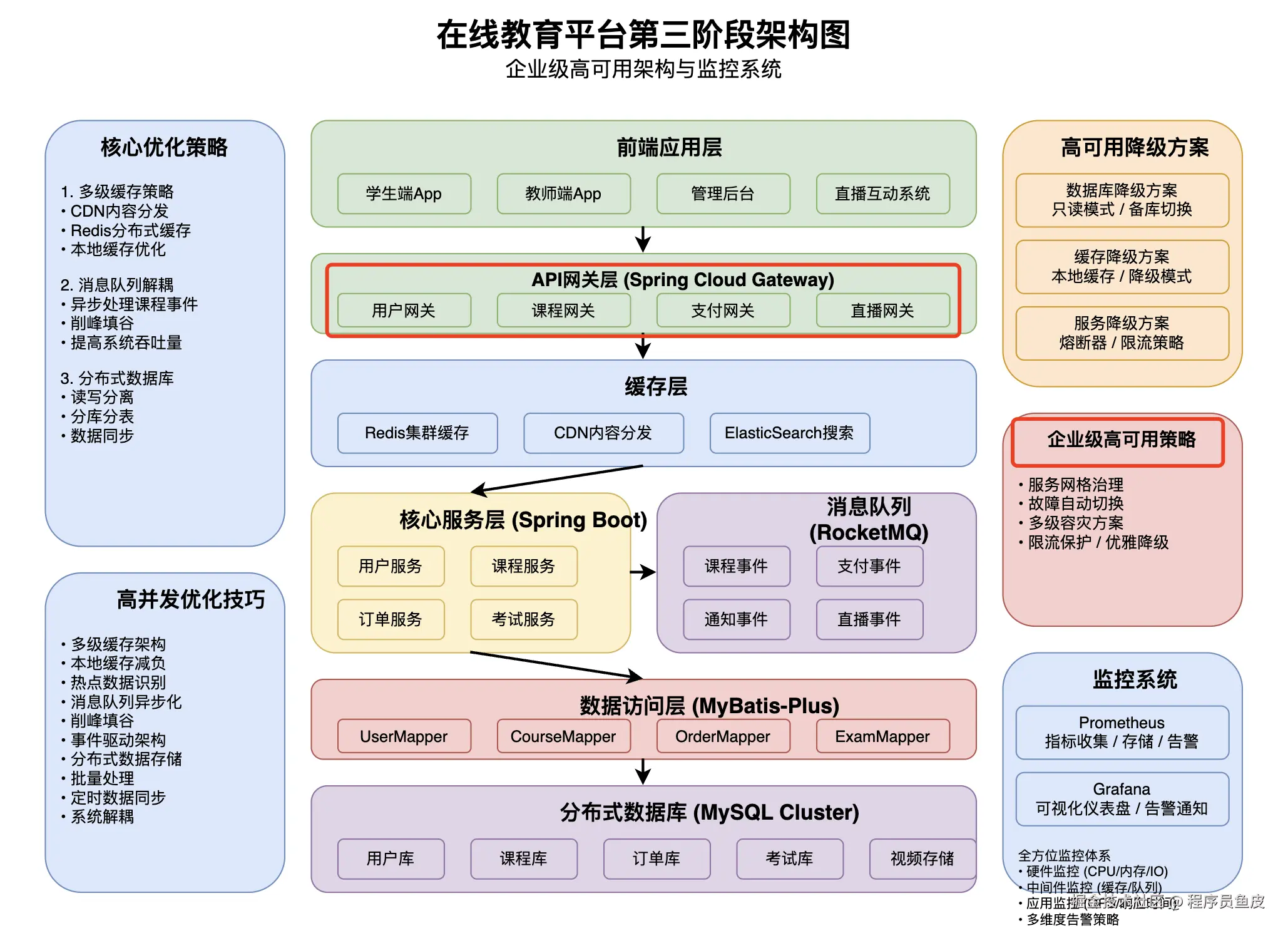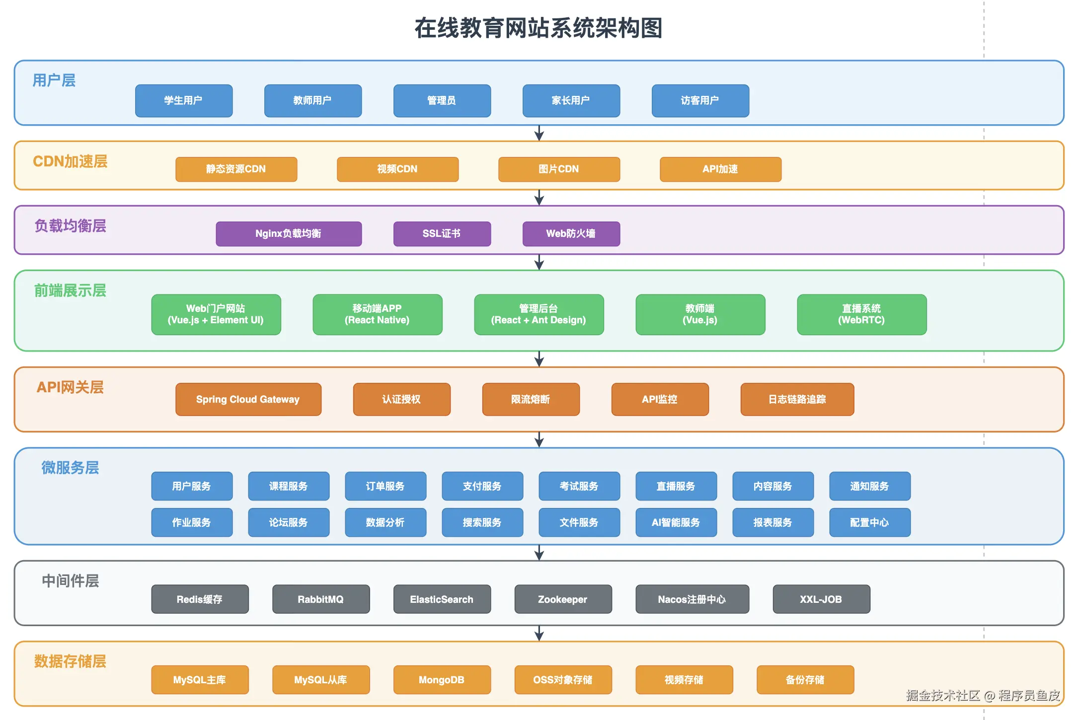 - 包含用户端、管理端、API 网关、核心服务、数据存储等模块