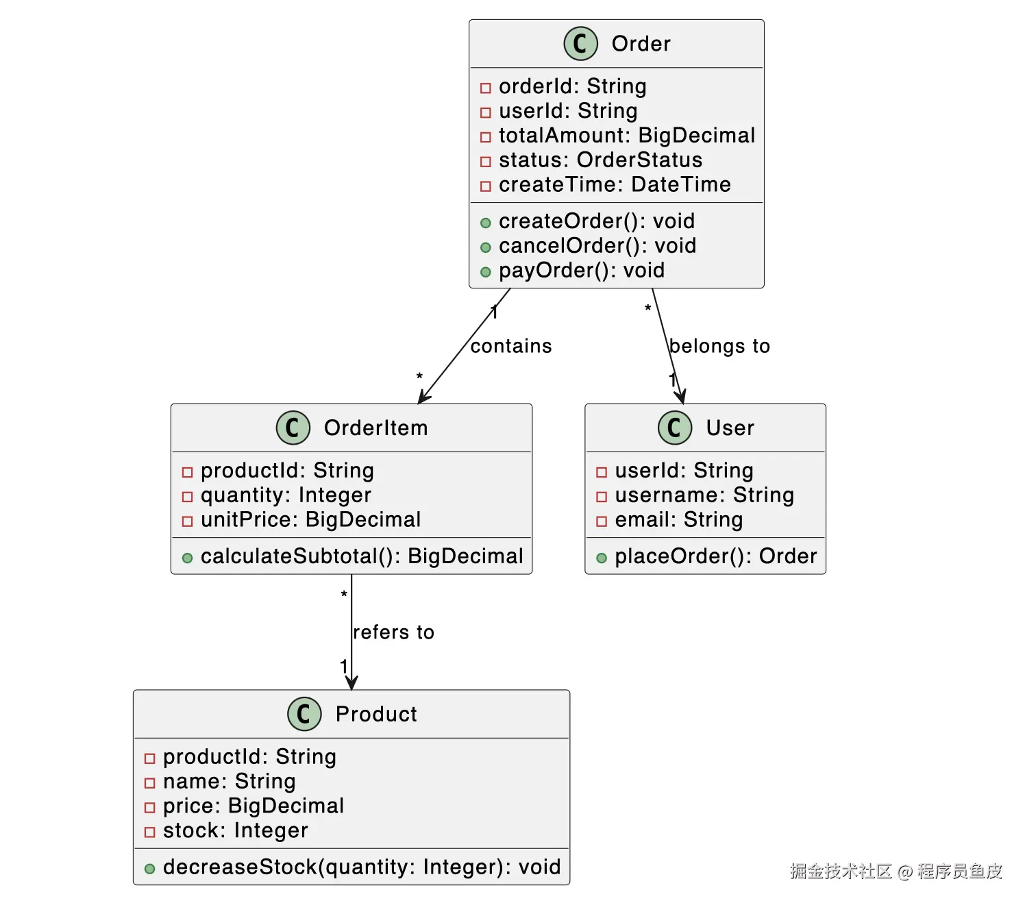 让我们用 AI + PlantUML 画一个经典的订单系统类图,给 AI 的提示词如下: