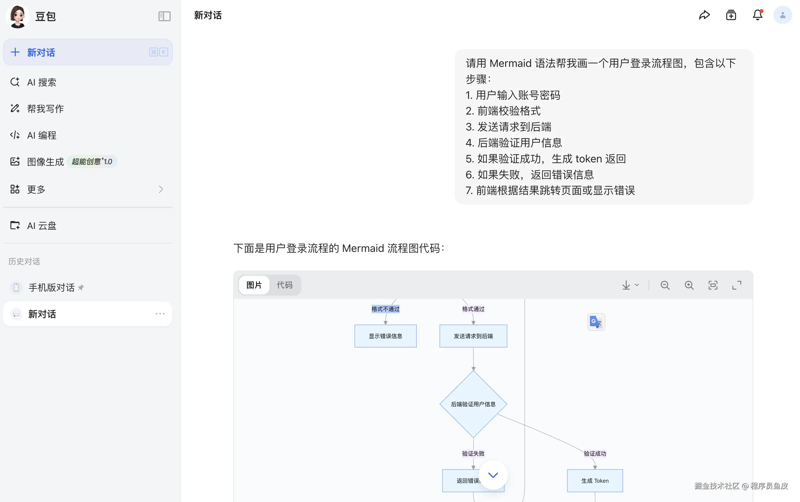 此外,现在很多 AI 聊天助手内置了 Mermaid 渲染工具,能直接看到效果并下载: