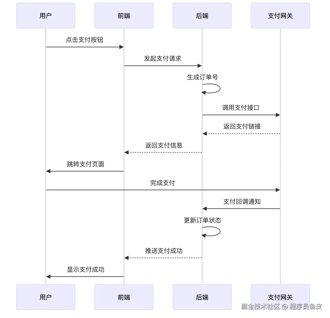 请用 Mermaid 画一个订单支付的时序图,展示用户、前端、后端、支付网关之间的交互