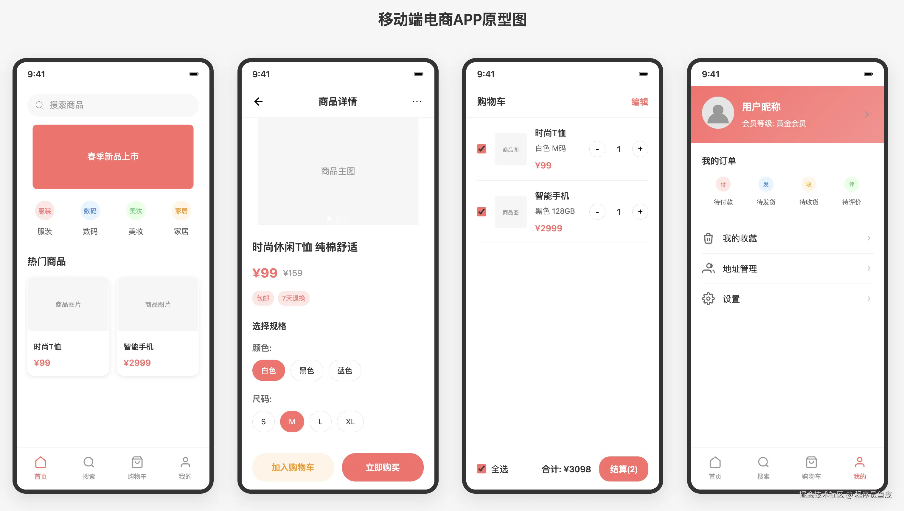 你是一位专业的 UI 设计师,请生成一个移动端电商APP的完整原型图,要求: