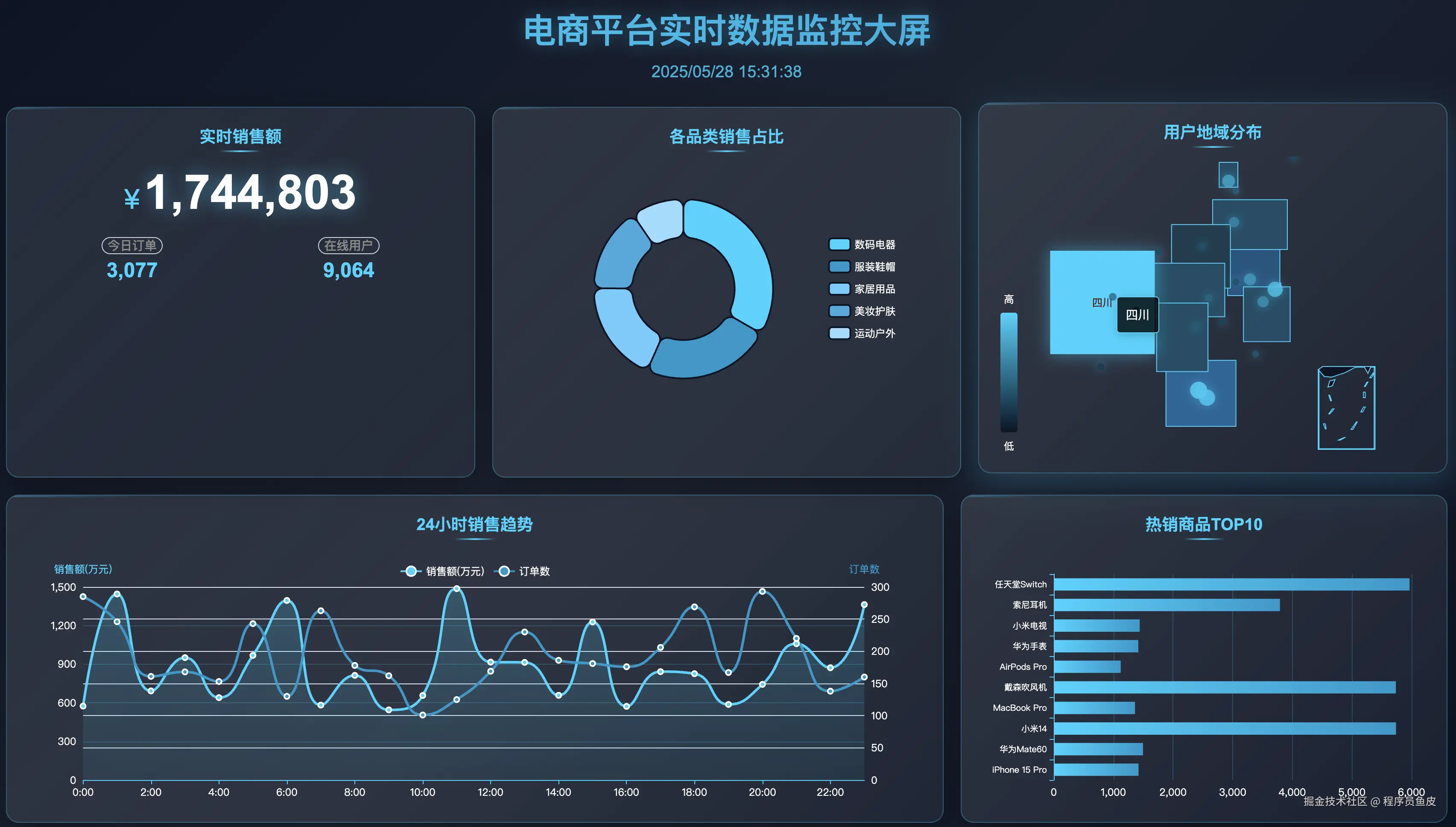 请生成一个数据可视化大屏页面,展示电商平台的实时数据: