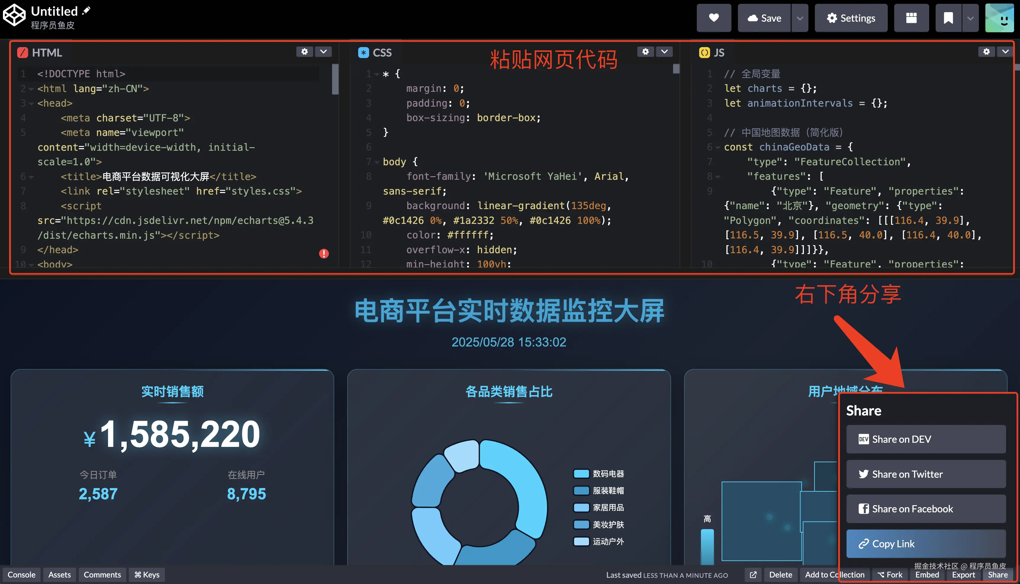 你可以直接按需截图,得到图片;还可以通过 Codepen 等网站运行工具将生成的网站快速分享给其他人。