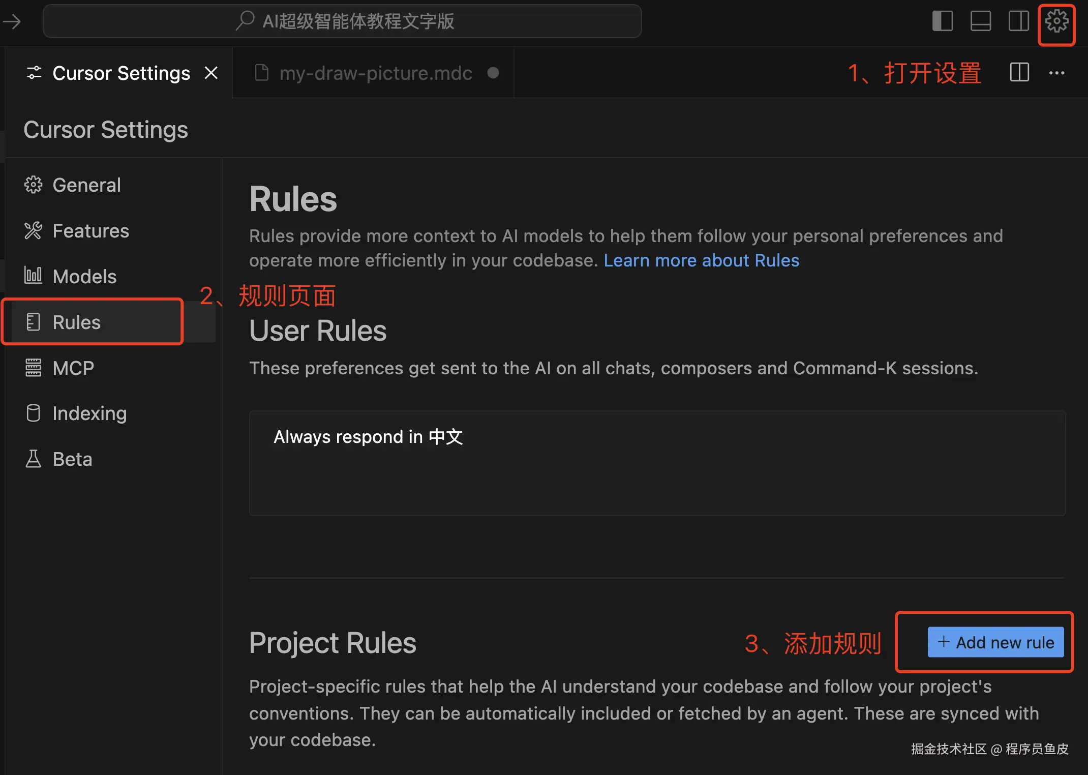 进入 Cursor 的 Rules 设置界面,添加一个规则:
