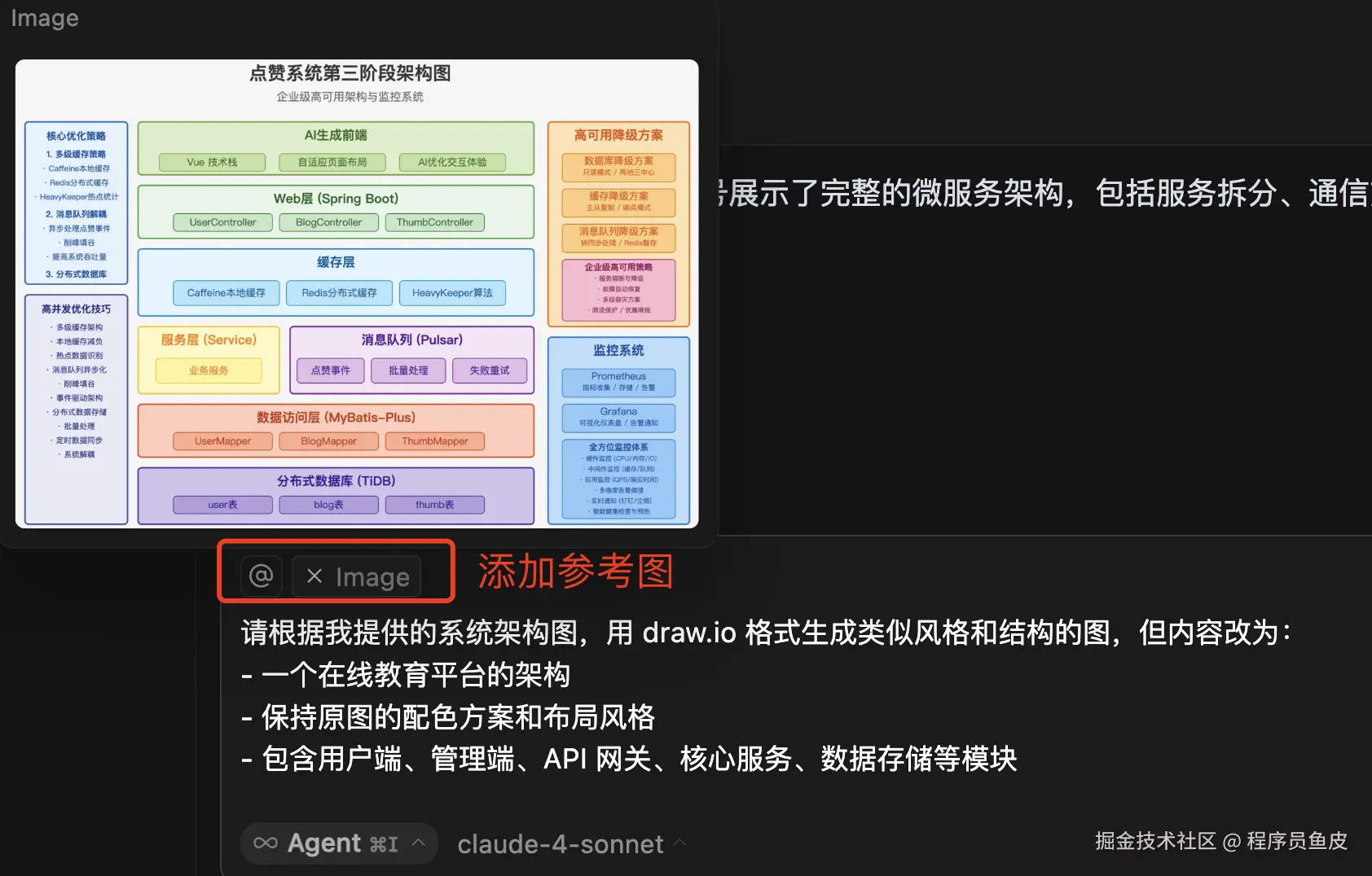 举个例子,仿照我提供的系统架构图进行生成,这种场景适合使用 draw.io 工具。示例 Prompt 如下: