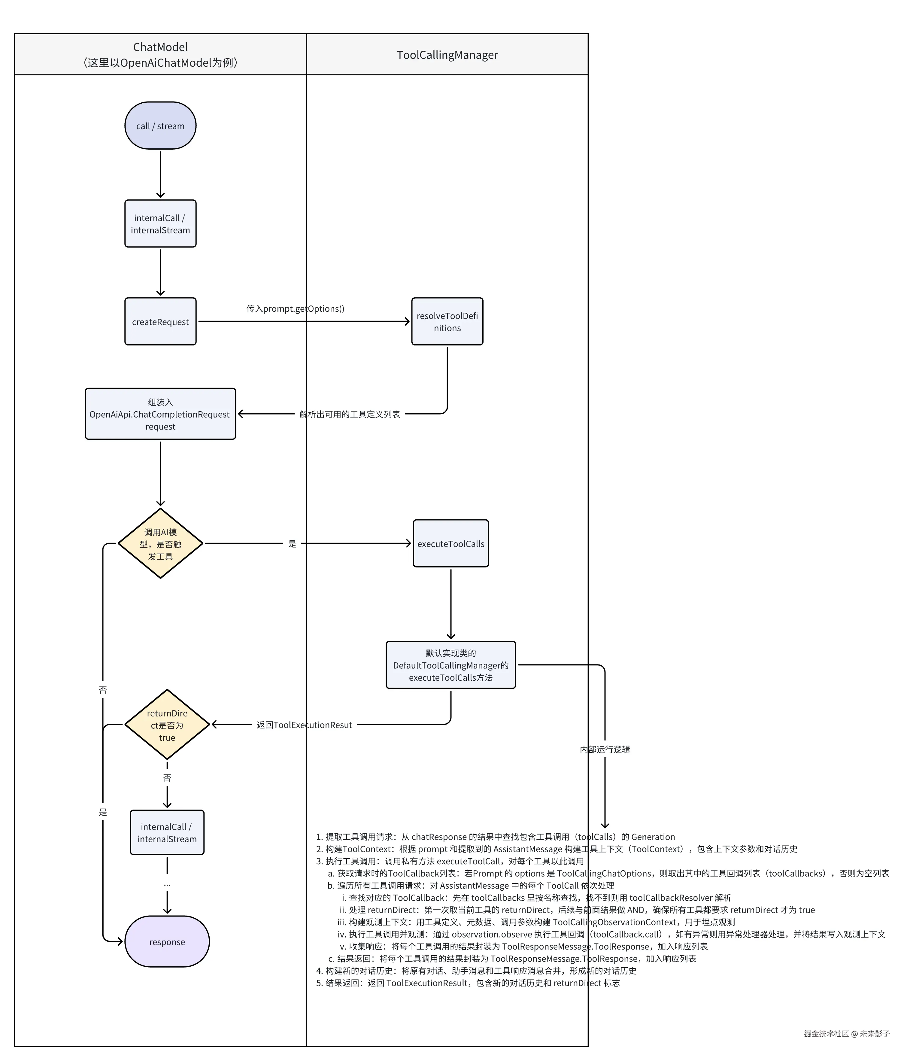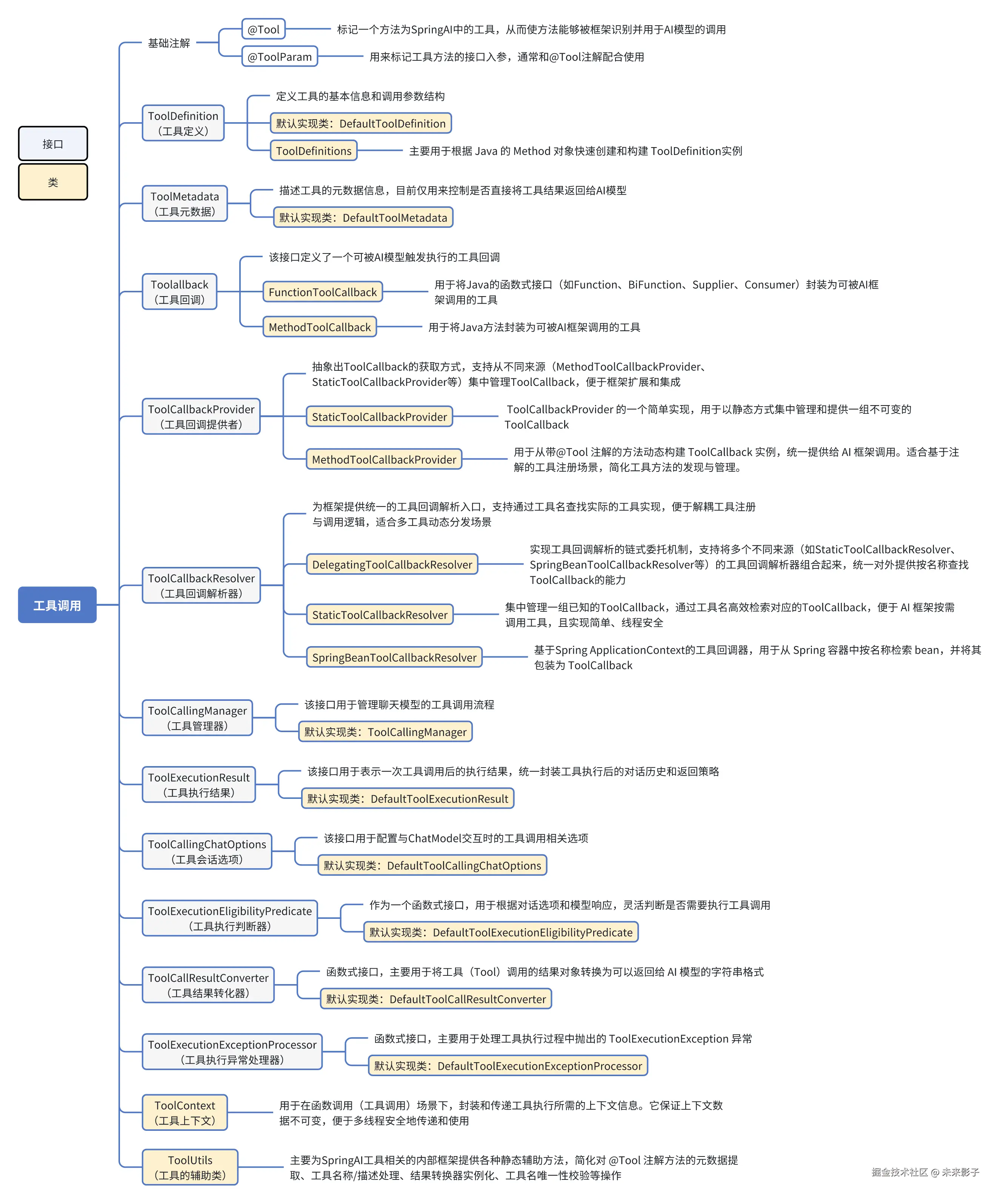 | toolCallingManager | 提供ToolCallingManager的Bean,调用的核心管理器,负责协调工具回调解析、异常处理、观测注册等 |