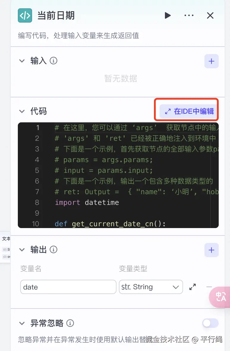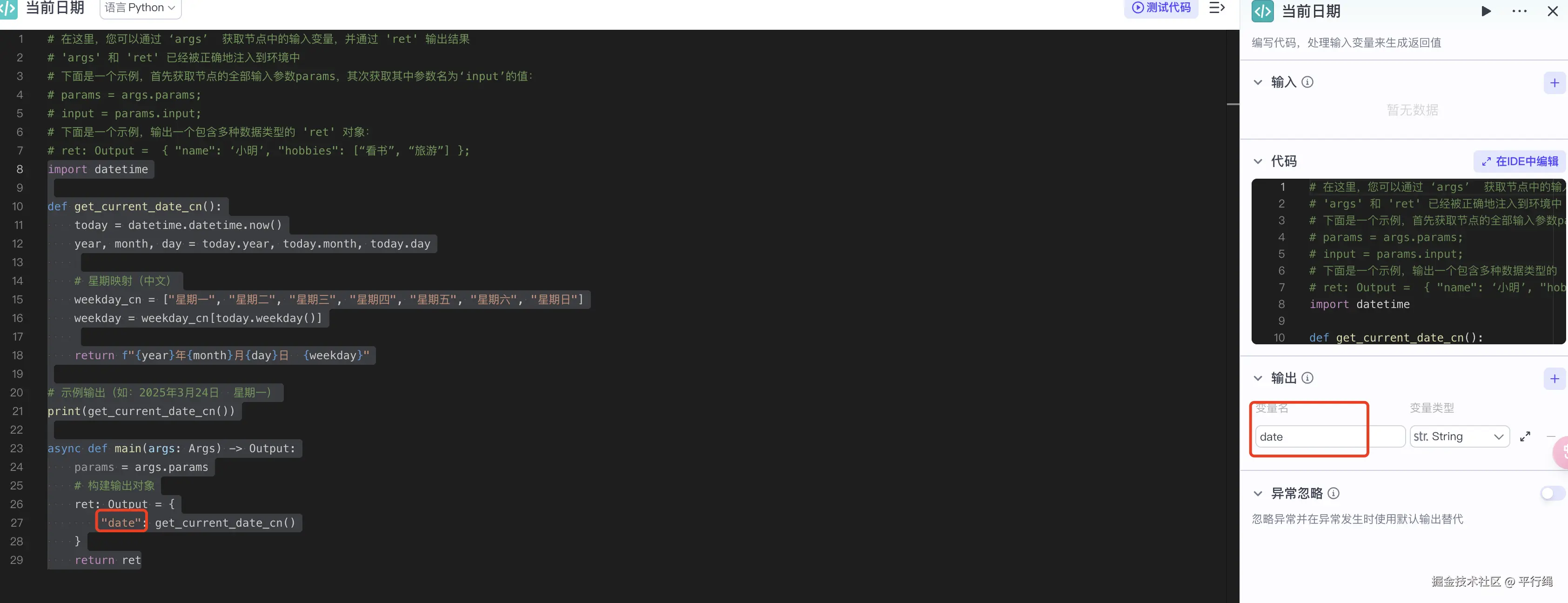 这里有一点需要注意⚠️,代码里输出字段date需要和节点输出变量名一致,不然代码运行会报错!