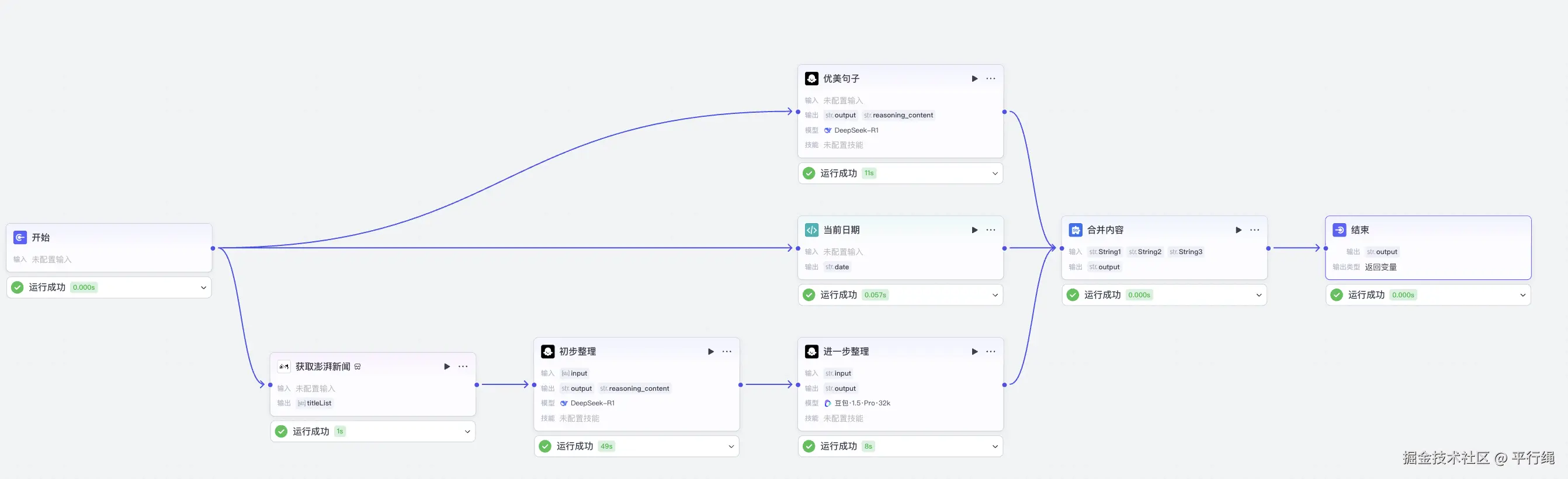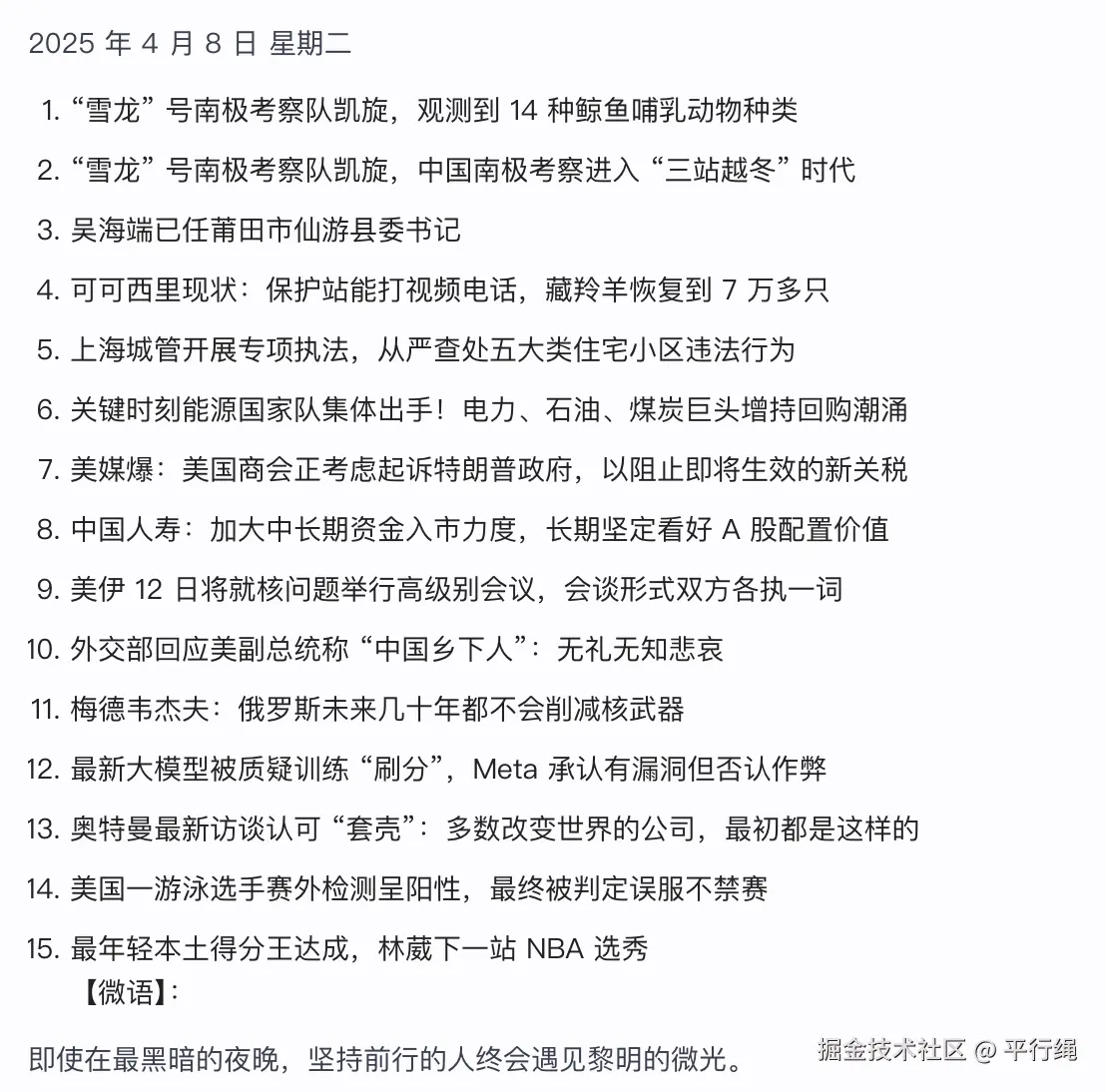 本篇将上篇中完成的插件拿来使用,利用大模型对新闻标题进行了筛选,学习了代码节点的使用,实现了 60s 新闻速递功能。最后,在格式上留下了一点瑕疵,就当是作业了,可以利用已经学到的知识来优化。