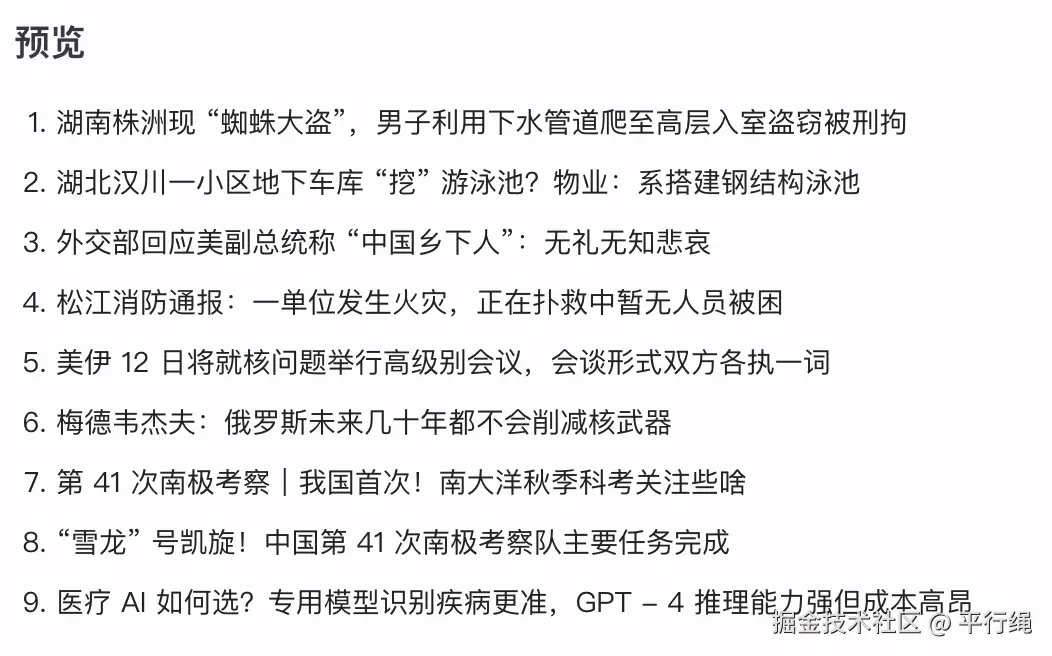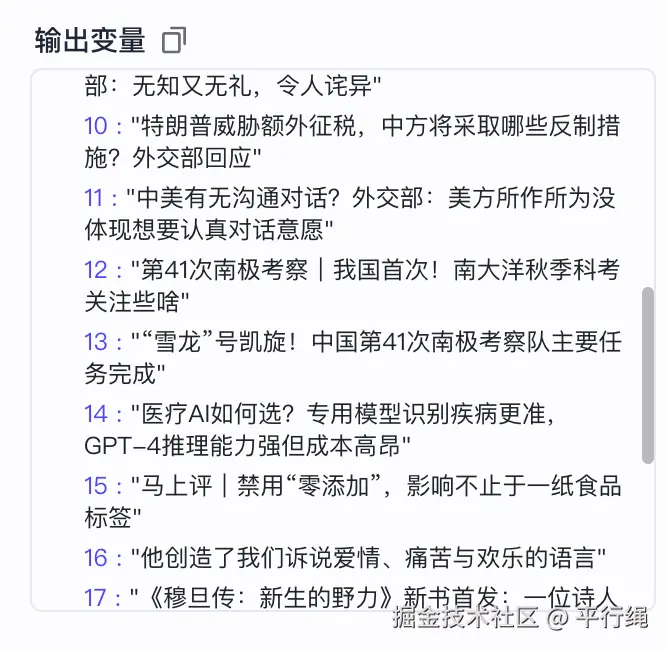 从输出中可以发现,有的标题并没有什么意义,无法通过标题判断出新闻内容,我们需要的是可以从标题中知道新闻内容的标题,这是就需要加入大模型节点来帮我们整理这些新闻标题了。