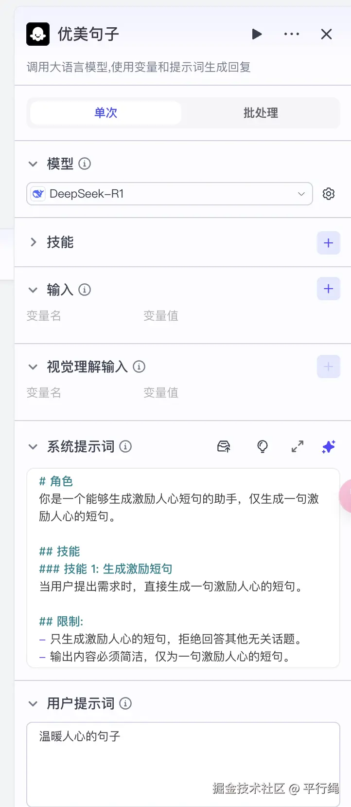在新闻的底部添加优美的句子,同样是使用大模型节点,这就很熟悉了,不用过多介绍了,看下大模型的配置