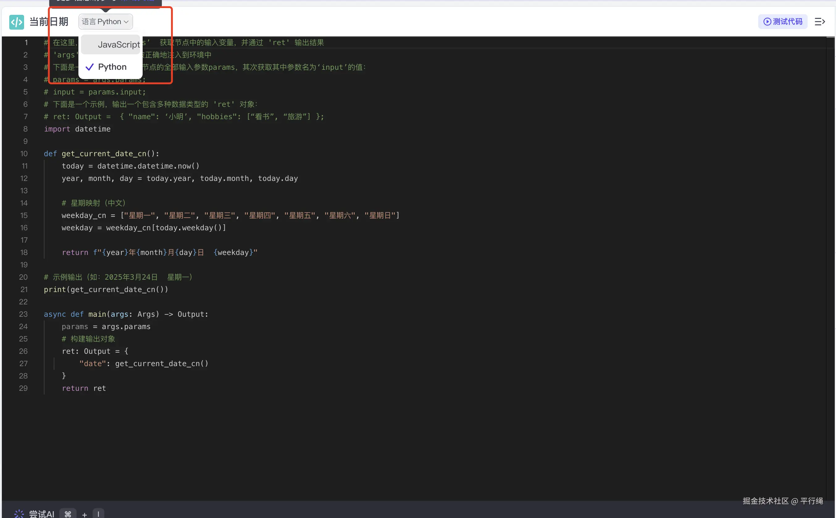 将代码节点加入到工作流后,点击 在 IDE 中编辑就到了代码编辑界面,在代码编辑界面,可以选择编程语言
