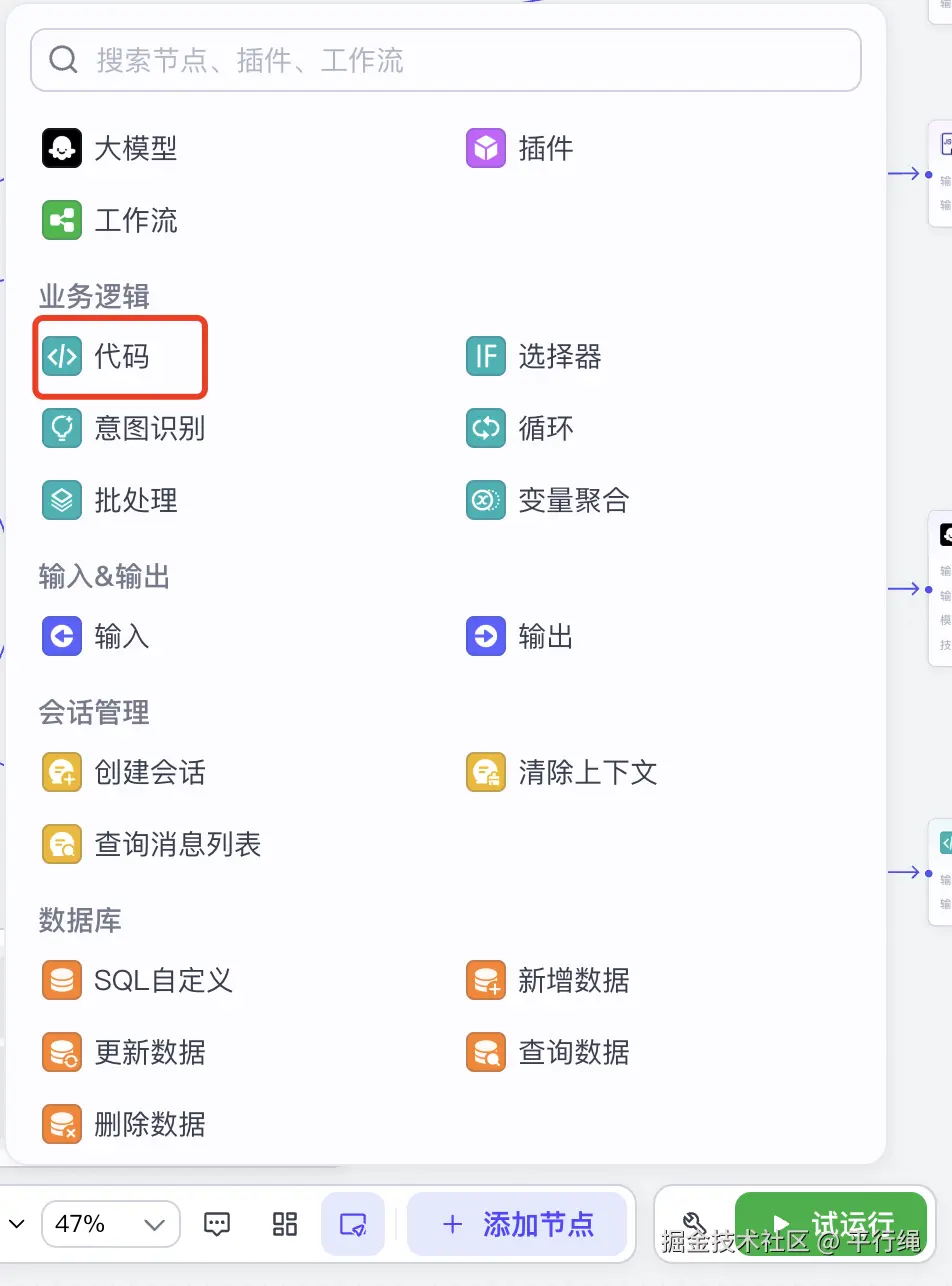 添加日期的话,可以从插件库中选择日期的插件,这里就不用插件库中的插件了,借此机会学习一下怎么在工作流中使用代码节点,点击“添加节点”后,可以在节点里面找到代码节点