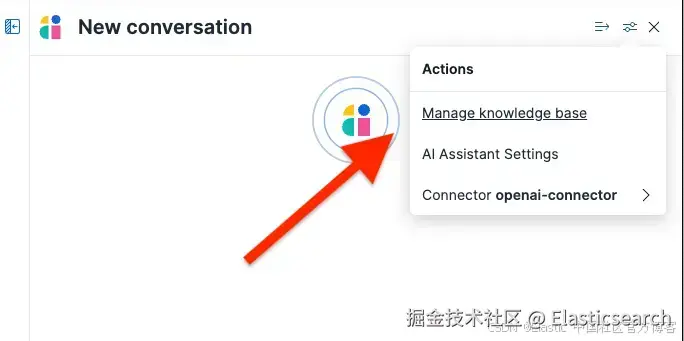 当我们的连接器准备好后,我们需要上传公司的知识库,以确保回答准确且有上下文。要进入该页面,点击 Actions > Manage knowledge base,该选项位于助手对话窗口下方。