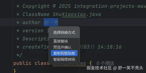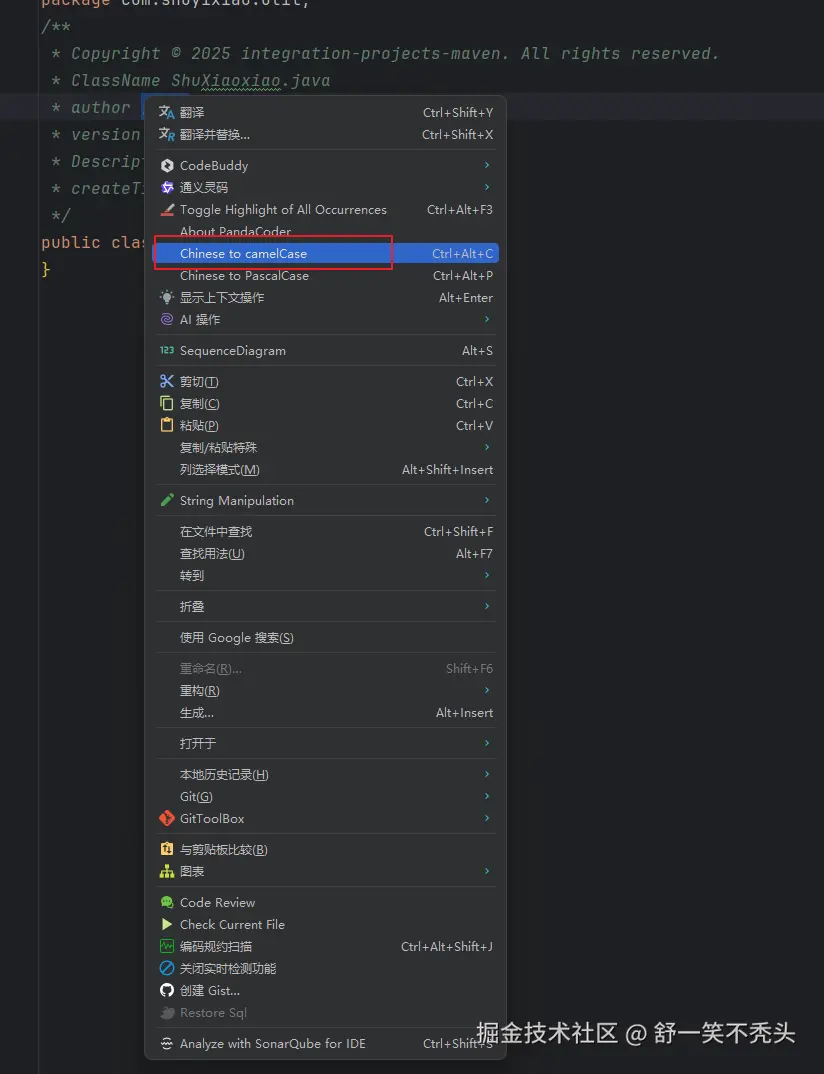 选中中文文本,右键转换为小驼峰命名格式(首字母小写),快捷键Ctrl+Alt+C