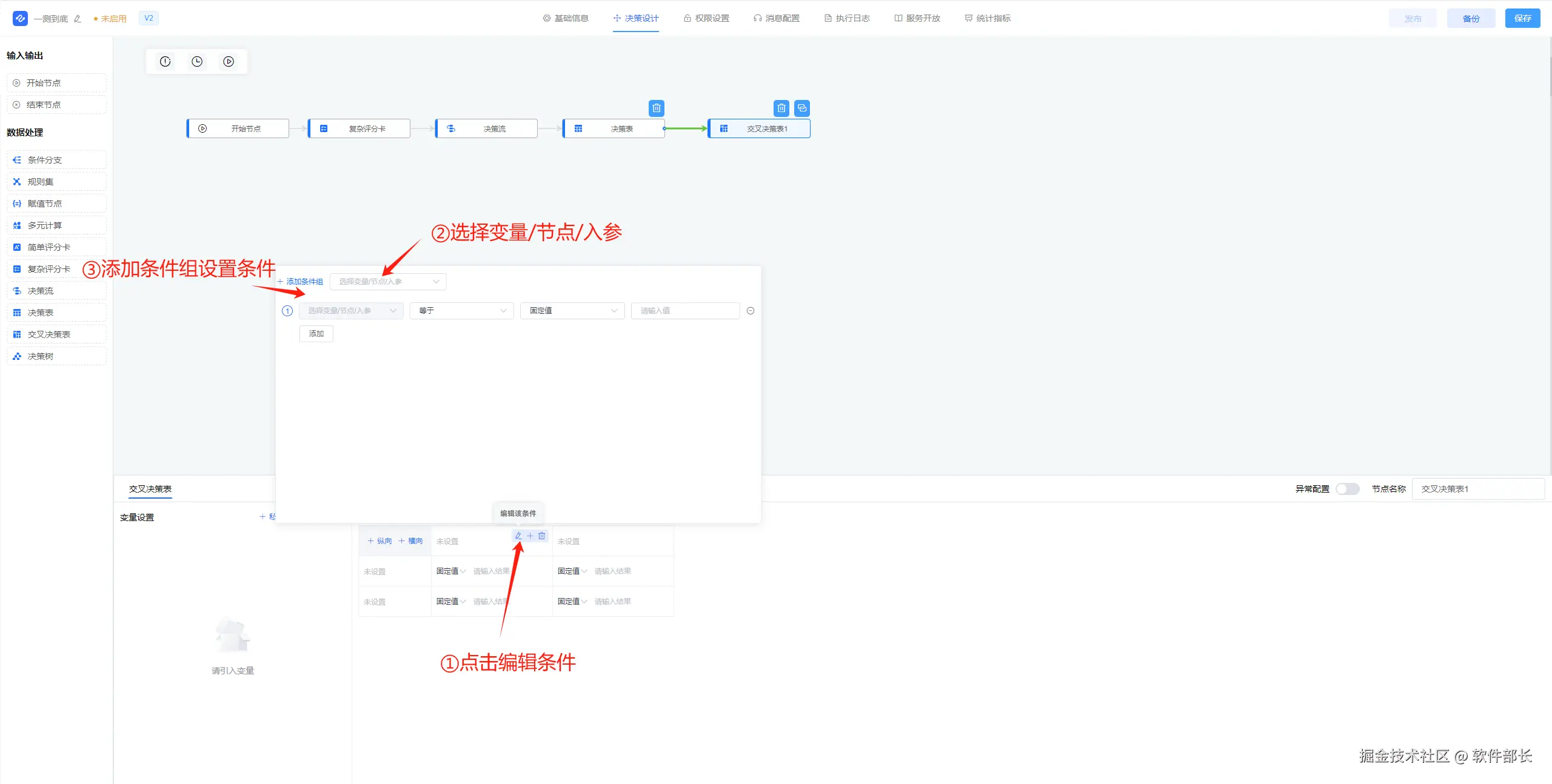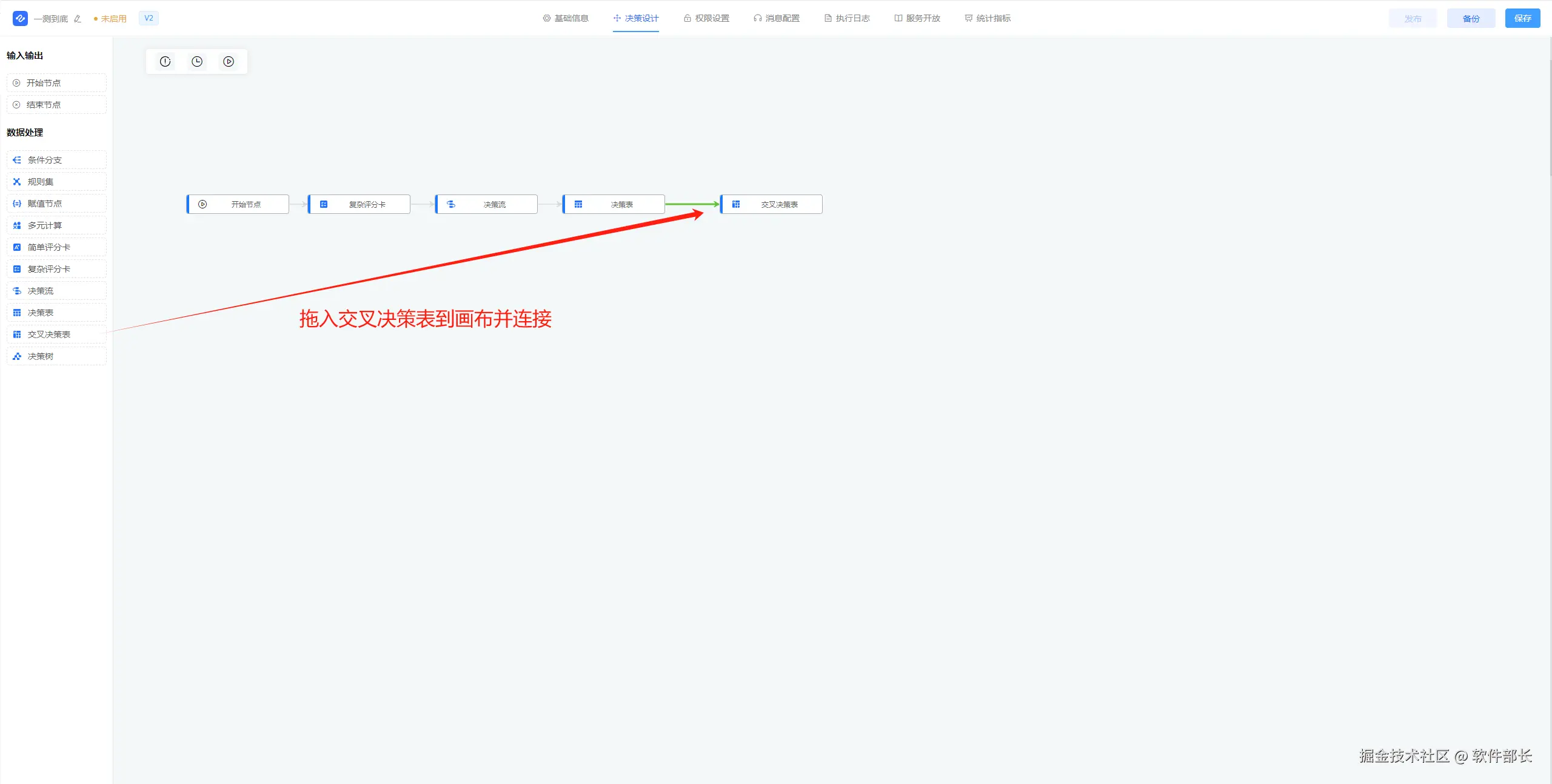1、拖入交叉决策表节点,连接到决策的开始节点或者上游节点