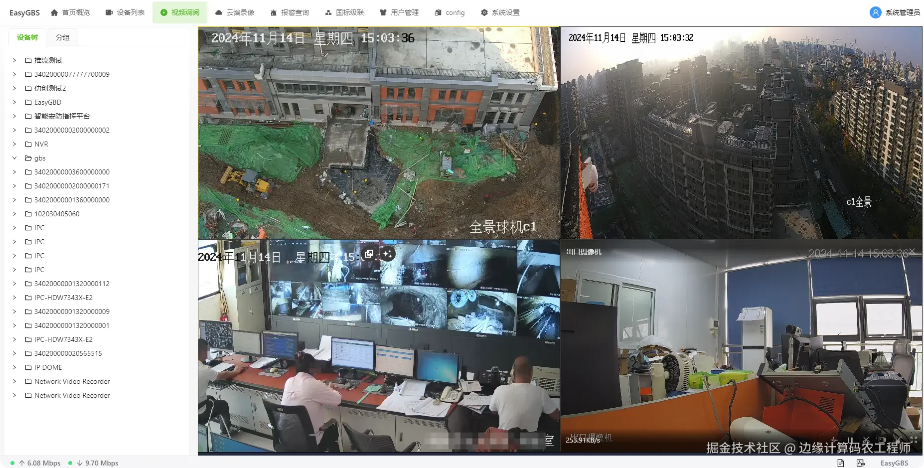 1)多屏播放:EasyGBS提供灵活的多屏播放模式,支持单屏、4分屏、9分屏、16分屏及全屏显示,用户可将常用布局保存为预设,并支持一键清屏功能,操作便捷高效。