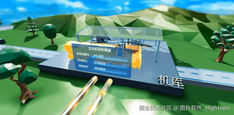 水路收发油站的场景复杂,林立的储油罐错落分布,错综复杂的输油管道如脉络般连接各处,大小不一的油船在水面频繁进出,各类装卸油设备及辅助设施密密麻麻。图扑运用 Low Poly 风格,对这些复杂元素进行了巧妙处理,储油罐简化为圆柱体,凸显储油功能;输油管道化作粗细线条,明晰油品输送路径;机库、油泵等辅助设备也被简化为几何形体,保留关键特征。