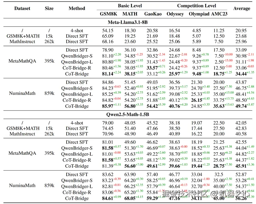 随后,团队基于 Qwen2.5-Math-7B 对模型进行指令微调,训练出 CoT-Bridge 模型。该模型能够作为独立组件,接收可能存在缺口的推理链输入,自动输出所需的中间步骤补全,从而生成结构完整的推理过程。
