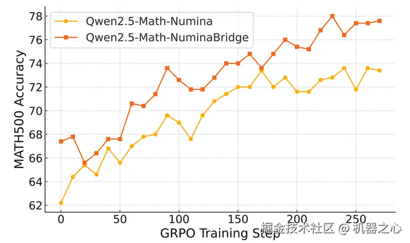 强化学习冷启动优化:在强化学习范式中,初始监督微调模型对最终性能具有重要影响。研究团队将使用 CoT-Bridge 生成的数据用于 SFT,并在此基础上继续训练。对比实验显示,该方案可作为更优的 “冷启动模型”,在训练初期即具备更高起点,并最终获得更好的收敛性能。在 NuminaMath 数据集上,基于补全后数据训练的模型在 RL 阶段最终准确率较原始方案提升约 +3.1%。