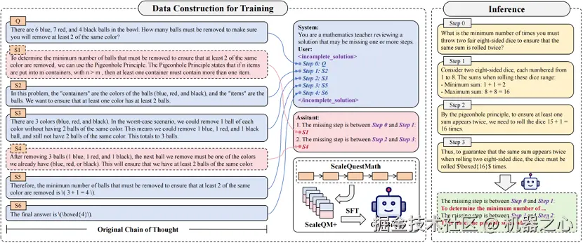 团队将 ScaleQuestMath 作为 “理想” CoT 数据集,并基于其构建了专用训练数据集 ScaleQM+。研究团队通过有控制地删除原始推理链中的若干中间步骤,构造出含有 Thought Leap 的 “不完整推理链”,并与被删除的步骤配对,作为训练样本。这一设计使得模型能够学习到如何识别不连贯结构,并生成适当的推理补全内容。