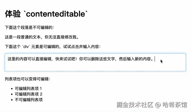 <p>下面这个 `div` 元素是可编辑的,试试点击并输入内容:</p>