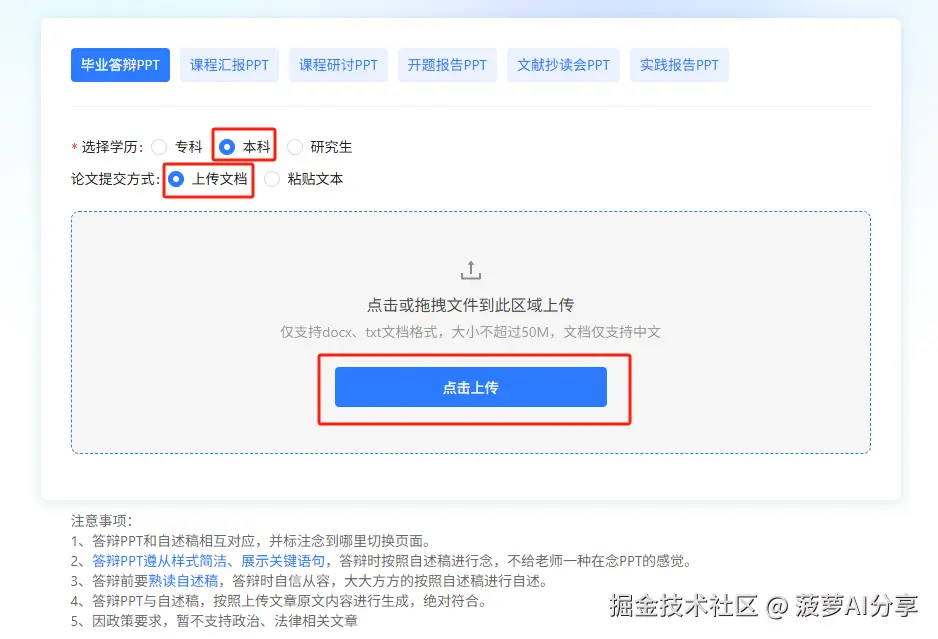 第二步:根据答辩类型选择,毕设直接选择 【毕业答辩PPT】 就可以啦,选择学历和提交方式,笔灵支持 【上传文档】和【粘贴文本】 两种形式,然后上传你的论文文档,docx和txt文档格式都可以哦~