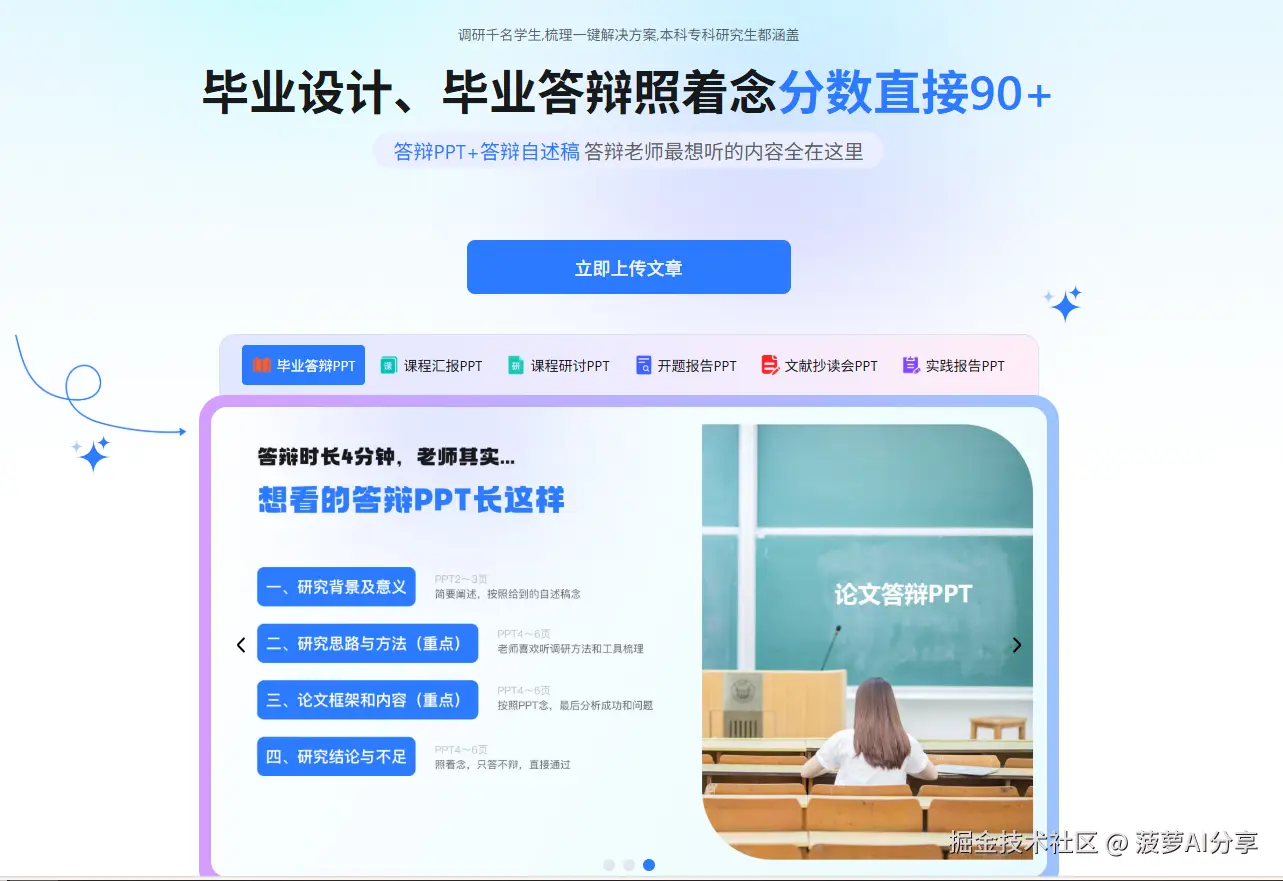 以上就是今天给大家推荐的四个AI生成PPT的工具,大家可以根据自己的需求去筛选最适合自己的工具,最后希望大家都答辩顺利啦,始终记得:完成比完美更重要!追求优秀答辩的同学可以忽略哈哈哈哈,也希望大家的毕设都圆满结束,不给自己的大学生活留遗憾。