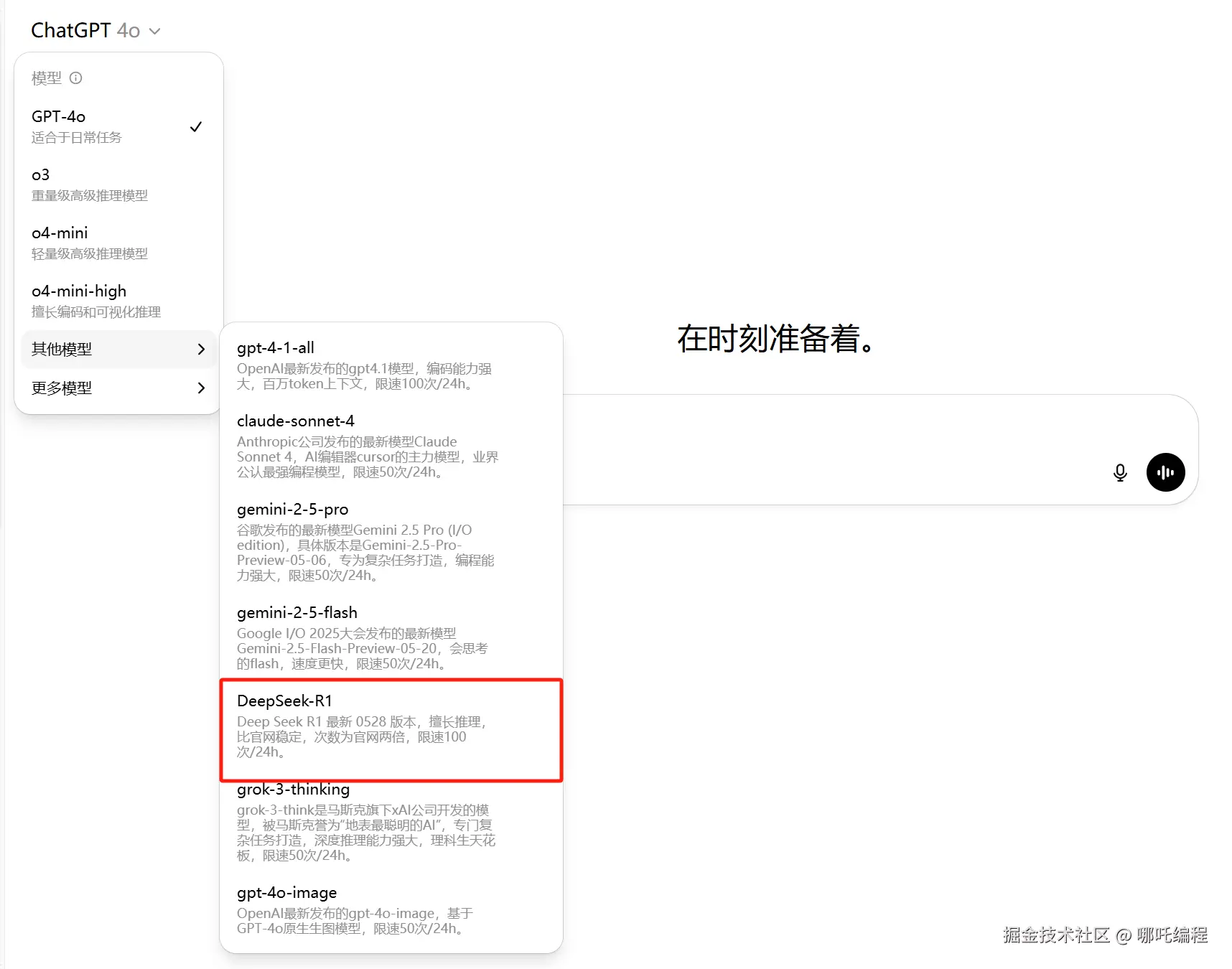 还包含了ChatGPT4o(支持原生文生图,不降智)、o4-mini(支持Deep Research深入研究)、o4-mini-high、o3、Claude Sonnet 4、GPT4.5、GPT4.1、Gemini 2.5 Pro Preview 0506、Grok3 thinking等模型。