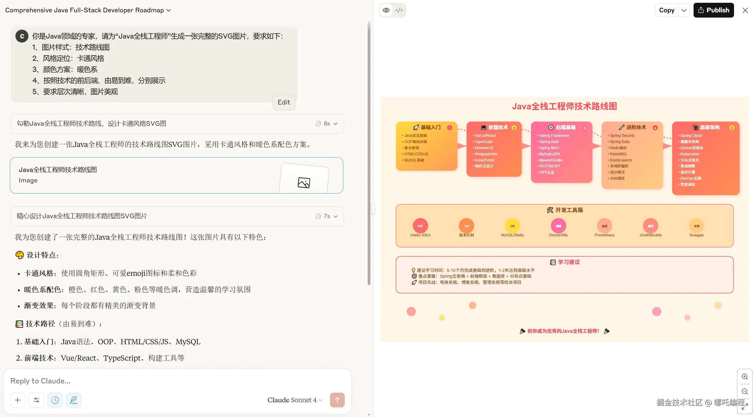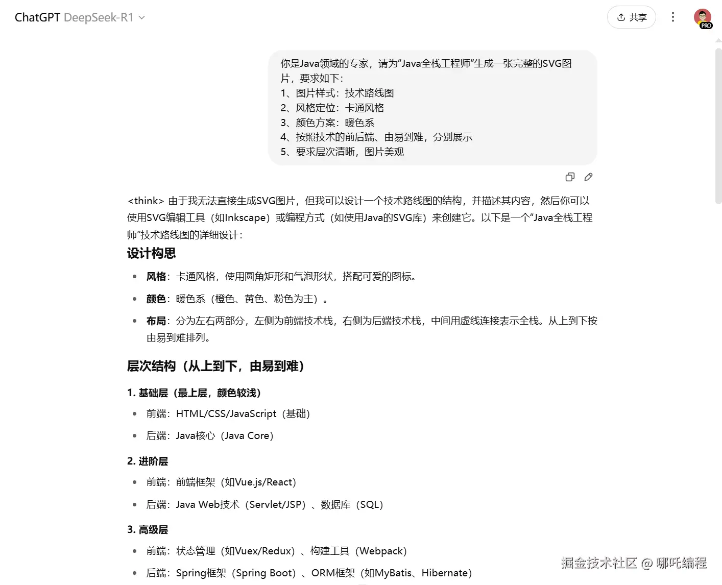 DeepSeek R1 0528在SVG生成中不仅实现了美观的卡通风格设计,更通过动态效果、层次化配色和复用结构显著提升了技术路线图的可读性和表现力,特别适合用于技术学习路径的可视化展示。