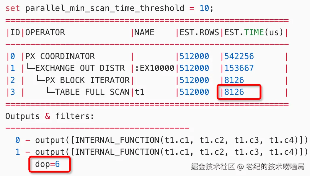 - 如果需要精细地对 Auto DOP 的并行度进行控制,就需要对控制并行度下限(启用并行执行的起步价 parallel_min_scan_time_threshold)和上限(节点中用于并行执行的线程数上限 parallel_servers_target,以及单条 SQL 中的线程数上限 parallel_degree_limit),根据机器配置和实际需求进行调整。如果不设置,默认就会把尽量多的资源给并行执行去使用(对于纯 AP 场景也许就是最优解)。