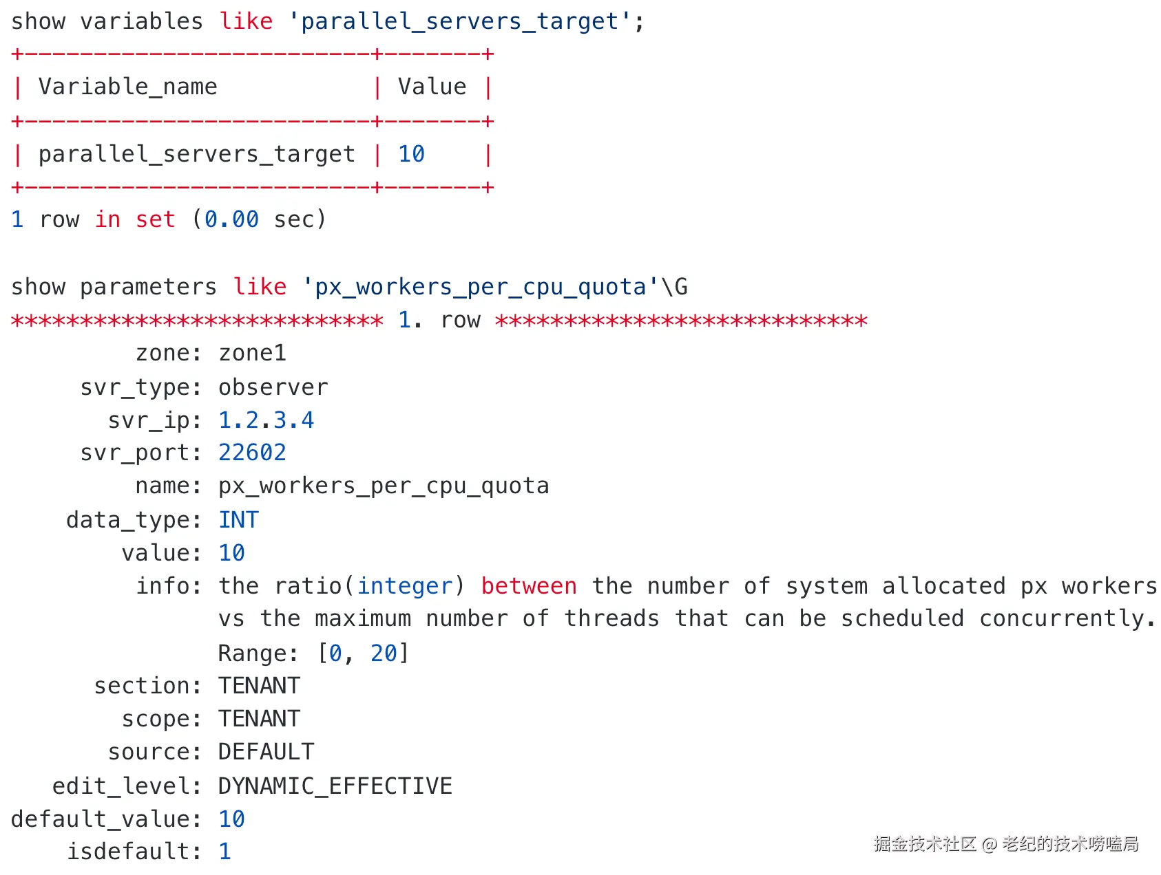 parallel_servers_target 这个参数是一个租户级系统变量,表示租户在每个节点上可申请的并行执行线程数量。默认值是 MIN CPU * px_workers_per_cpu_quota。