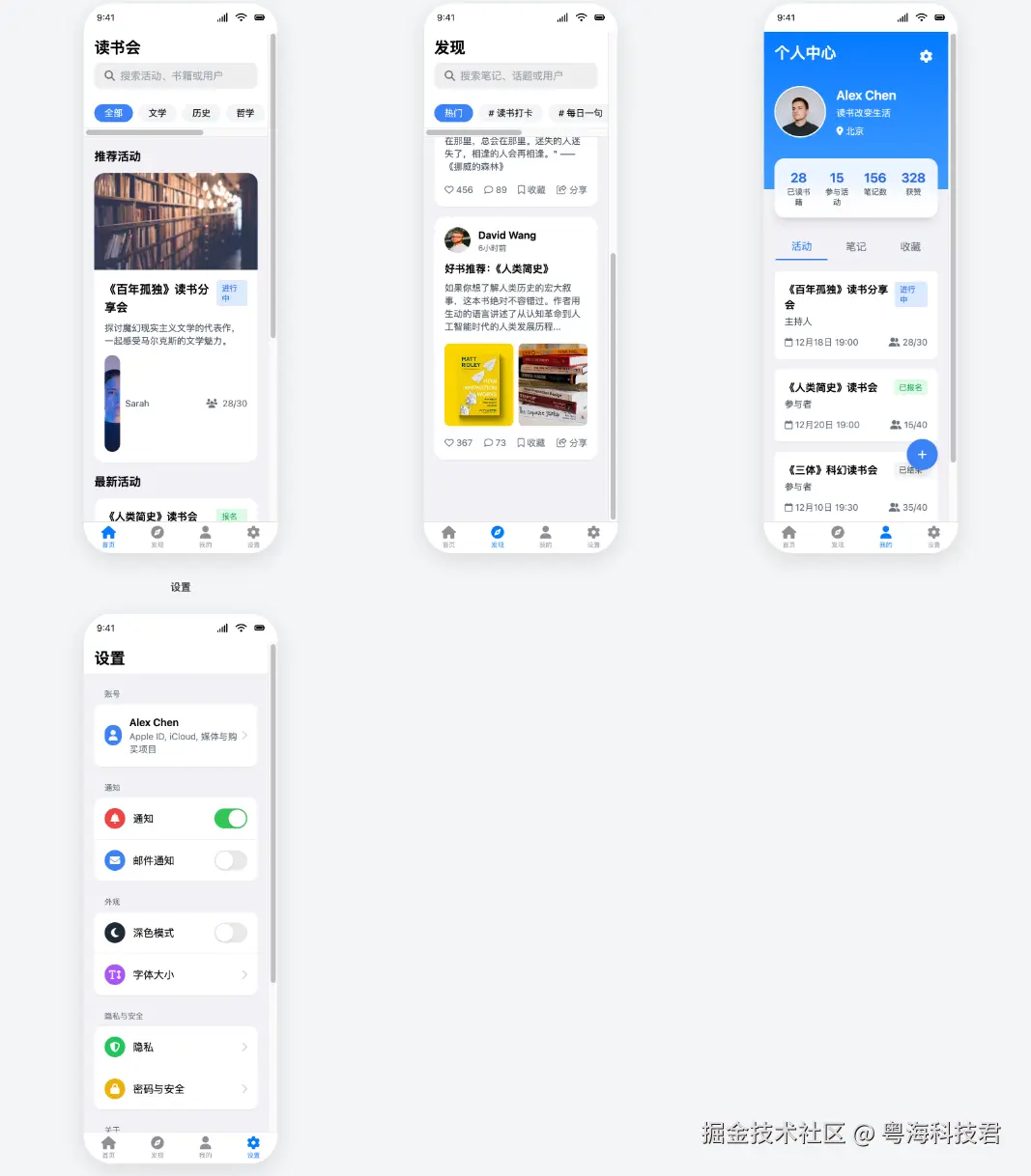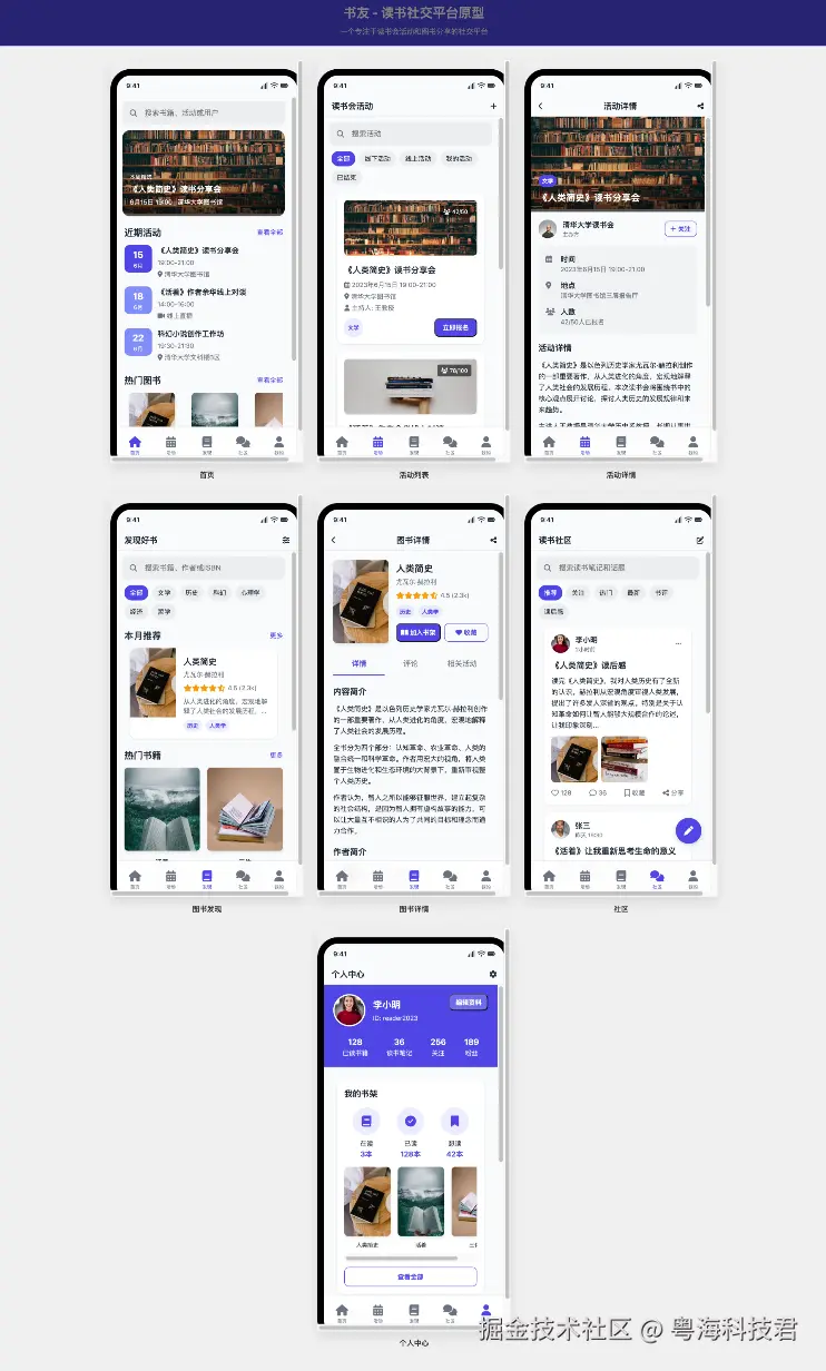 我想开发一个{类似 **清华大学书友小程序,会不定期举办读书会活动** },现在需要输出高保真的原型图,请通过以下方式帮我完成所有界面的原型设计,并确保这些原型界面可以直接用于开发: