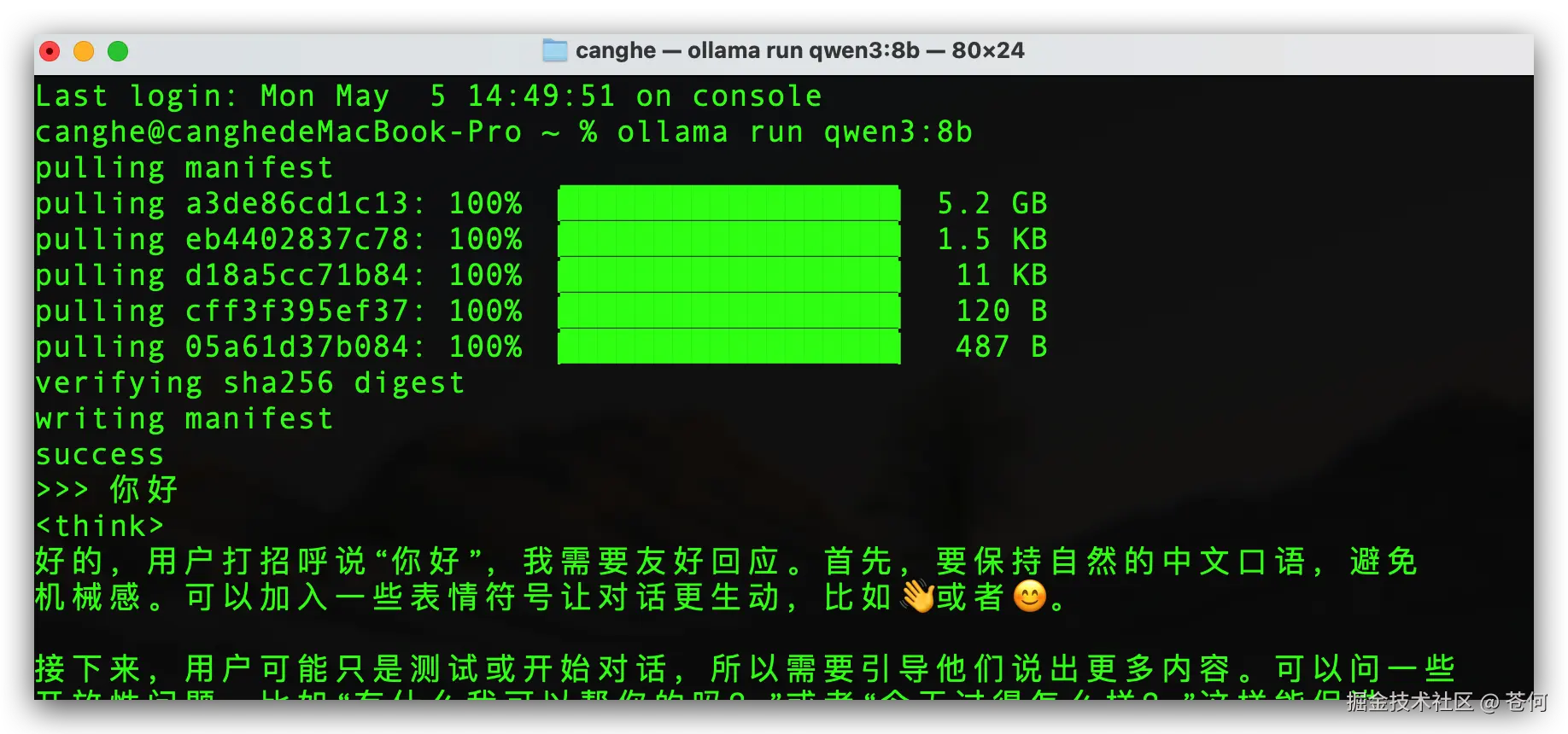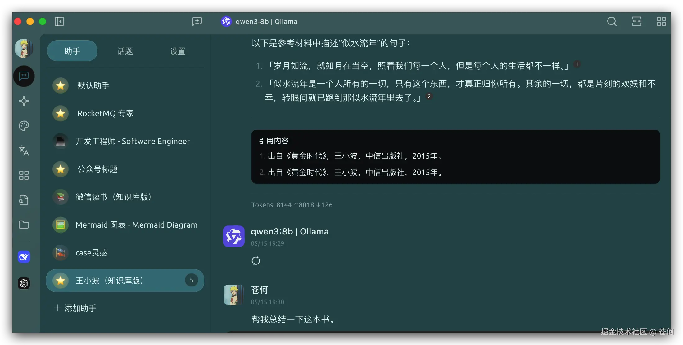 我的 Mac 部署的是最新的 Qwen3-8b,如果配置再好点,搞个 14b,那效果又上一个层次了。