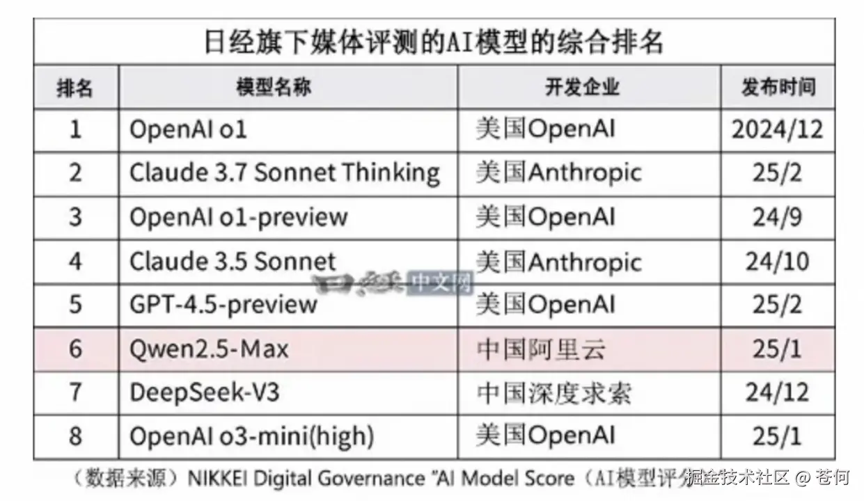 还有一个很让我意外的新闻,国际权威媒体日本经济新闻(NIKKEI)4月公开的AI模型评分榜,阿里的通义千问在113个模型中排名第6,是排名第一的开源模型。