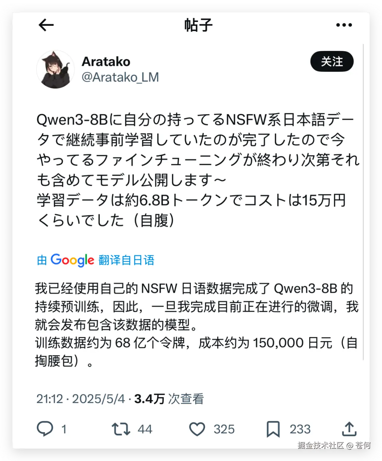 还有这个日本老哥(或是老姐?)用 Qwen3-8 B 进行日语微调。
